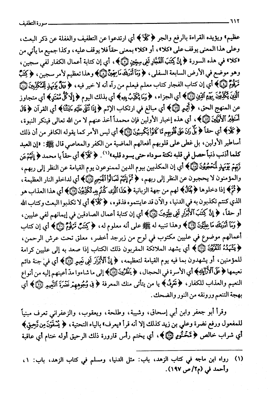 عظيم» ويؤيده القراءة بالرفع والجر كَلَّا أي ارتدعوا عن التطفيف والغفلة عن ذكر البعث، وعلى هذا المعنى يوقف على «كلا» أو «كلا» بمعنى حقا فلا يوقف عليه، وكذا جميع ما يأتي من «كلا» في هذه السورة إِنَّ كِتابَ الفُجَّارِ لَفِي سِجِّينٍ (7) ، أي إن كتابة أعمال الكفار لفي سجين، وهو موضع في الأرض السابعة السفلى، وَما أَدْراكَ ما سِجِّينٌ (8) وهذا تعظيم لأمر سجين، كِتابٌ مَرْقُومٌ (9) أي إن كتاب الفجار كتاب معلم فيعلم من رآه أنه لا خير فيه،