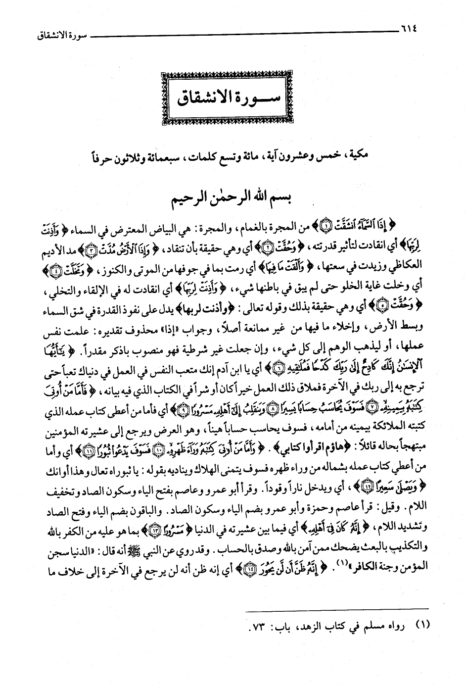 إِذَا السَّماءُ انْشَقَّتْ (1) من المجرة بالغمام، والمجرة: هي البياض المعترض في السماء وَأَذِنَتْ لِرَبِّها أي انقادت لتأثير قدرته، وَحُقَّتْ (2) أي وهي حقيقة بأن تنقاد، وَإِذَا الْأَرْضُ مُدَّتْ (3) مد الأديم العكاظي وزيدت في سعتها، وَأَلْقَتْ ما فِيها أي رمت بما في جوفها من الموتى والكنوز، وَتَخَلَّتْ (4) أي وخلت غاية الخلو حتى لم يبق في