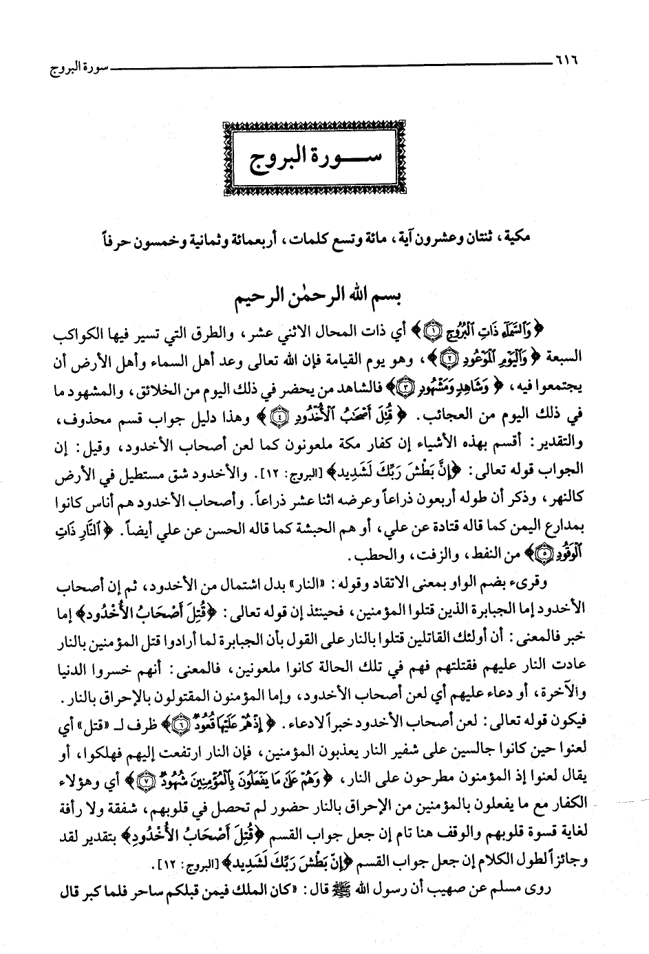 وَالسَّماءِ ذاتِ الْبُرُوجِ (1) أي ذات المحال الاثني عشر، والطرق التي تسير فيها الكواكب السبعة وَالْيَوْمِ الْمَوْعُودِ (2) ، وهو يوم القيامة فإن الله تعالى وعد أهل السماء وأهل الأرض أن يجتمعوا فيه، وَشاهِدٍ وَمَشْهُودٍ (3) فالشاهد من يحضر في ذلك اليوم من الخلائق، والمشهود ما في ذلك اليوم من العجائب. قُتِلَ أَصْحابُ الْأُخْدُودِ (4) وهذا دليل جواب قسم محذوف، والتقدير: أقسم بهذه الأشياء إن كفار مكة ملعونون كما لعن أصحاب الأخدود، وقيل: إن الجواب قوله تعالى: إِنَّ بَطْشَ رَبِّكَ لَشَدِيدٌ [البروج: 12] . والأخدود شق مستطيل في الأرض كالنهر، وذكر أن طوله أربعون ذراعا وعرضه اثنا عشر ذراعا. وأصحاب الأخدود هم أناس كانوا بمدارع اليمن كما قاله قتادة عن علي، أو هم الحبشة كما قاله الحسن عن علي أيضا. النَّارِ ذاتِ الْوَقُودِ (5) من النفط، والزفت، والحطب.