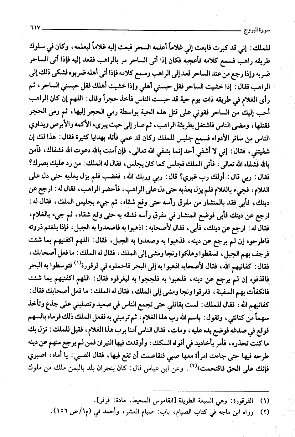 ارجع عن دينك فأبى فوضع المنشار في مفرق رأسه فشقه به حتى وقع شقاه، ثم جيء بالغلام، فقال له: ارجع عن دينك، فأبى، فقال لأصحابه: اذهبوا به فاصعدوا به الجبل، فإذا بلغتم ذروته فاطرحوه إن لم يرجع عن دينه، فذهبوا به وصعدوا به الجبل، فقال: اللهم اكفنيهم بما شئت فرجف بهم الجبل، فسقطوا وهلكوا ونجا ومشى إلى الملك، فقال له الملك: ما فعل أصحابك، فقال: كفانيهم الله، فقال لأصحابه اذهبوا به إلى البحر فاحملوه في قرقورة «1» فتوسطوا به البحر فاقذفوه إن لم يرجع عن دينه، فذهبوا به فلججوا به ليغرقوه فقال: اللهم اكفنيهم بما شئت فانكفأت بهم السفينة، فغرقوا ونجا ومشى إلى الملك، فقال له الملك: ما فعل أصحابك فقال: