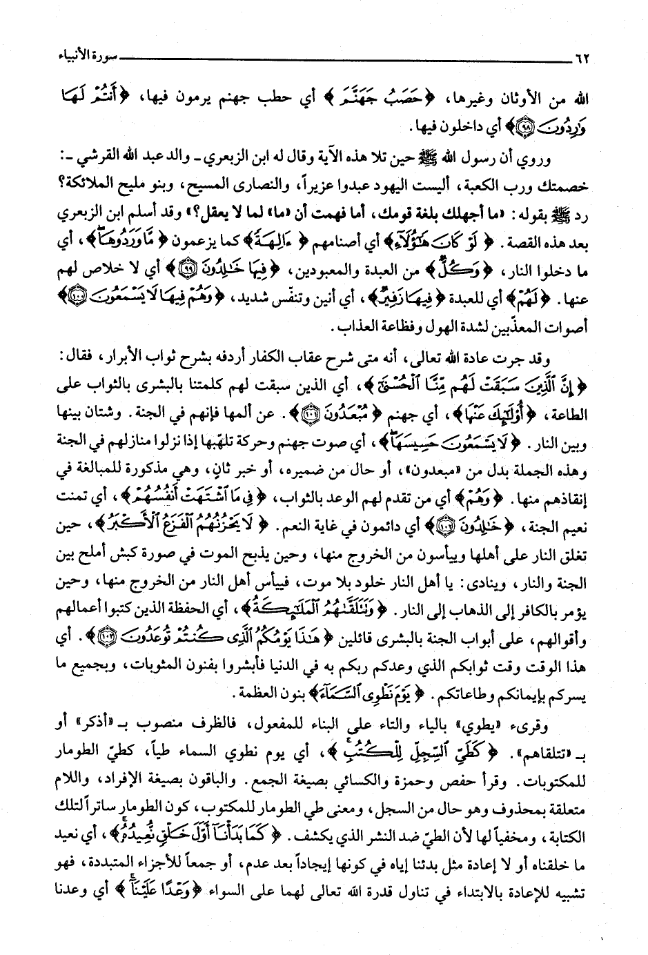 إِنَّ الَّذِينَ سَبَقَتْ لَهُمْ مِنَّا الْحُسْنى، أي الذين سبقت لهم كلمتنا بالبشرى بالثواب على الطاعة، أُولئِكَ عَنْها، أي جهنم مُبْعَدُونَ (101) . عن ألمها فإنهم في الجنة. وشتان بينها وبين النار. لا يَسْمَعُونَ حَسِيسَها، أي صوت جهنم وحركة تلهّبها إذا نزلوا منازلهم في الجنة وهذه الجملة بدل من «مبعدون» ، أو حال من ضميره، أو خبر ثان، وهي مذكورة للمبالغة في إنقاذهم منها. وَهُمْ أي من تقدم لهم الوعد بالثواب، فِي مَا اشْتَهَتْ أَنْفُسُهُمْ، أي تمنت نعيم الجنة، خالِدُونَ (102) أي دائمون في غاية النعم. لا يَحْزُنُهُمُ الْفَزَعُ الْأَكْبَرُ، حين تغلق النار على أهلها وييأسون من الخروج منها، وحين يذبح الموت في صورة كبش أملح بين الجنة والنار، وينادى: يا أهل النار خلود بلا موت،