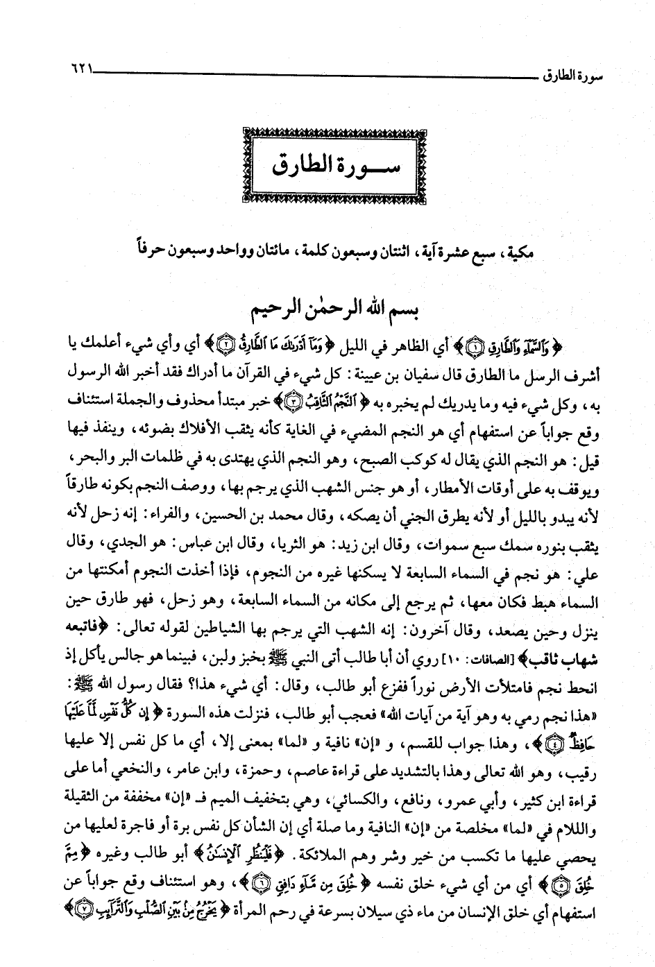 وَالسَّماءِ وَالطَّارِقِ (1) أي الظاهر في الليل وَما أَدْراكَ مَا الطَّارِقُ (2) أي وأي شيء أعلمك يا أشرف الرسل ما الطارق قال سفيان بن عيينة: كل شيء في القرآن ما أدراك فقد أخبر الله الرسول به، وكل شيء فيه وما يدريك لم يخبره به النَّجْمُ الثَّاقِبُ (3) خبر مبتدأ محذوف والجملة استئناف وقع جوابا عن استفهام أي هو النجم المضيء في الغاية كأنه يثقب الأفلاك بضوئه، وينفذ فيها قيل: هو النجم الذي يقال له كوكب الصبح، وهو النجم الذي يهتدى به في ظلمات البر والبحر، ويوقف به على أوقات الأمطار، أو هو جنس الشهب الذي يرجم بها، ووصف النجم بكونه طارقا لأنه يبدو بالليل أو لأنه يطرق الجني أن يصكه، وقال محمد بن الحسين، والفراء: إنه زحل لأنه يثقب بنوره سمك سبع سموات، وقال ابن زيد: هو الثريا، وقال ابن عباس: هو الجدي، وقال علي: هو نجم في السماء السابعة لا يسكنها غيره من النجوم، فإذا أخذت النجوم أمكنتها من السماء هبط فكان معها، ثم يرجع إلى مكانه من السماء السابعة، وهو زحل، فهو طارق حين ينزل وحين يصعد، وقال آخرون: إنه الشهب التي يرجم بها الشياطين لقوله تعالى: فَأَتْبَعَهُ شِهابٌ ثاقِبٌ [الصافات: 10]