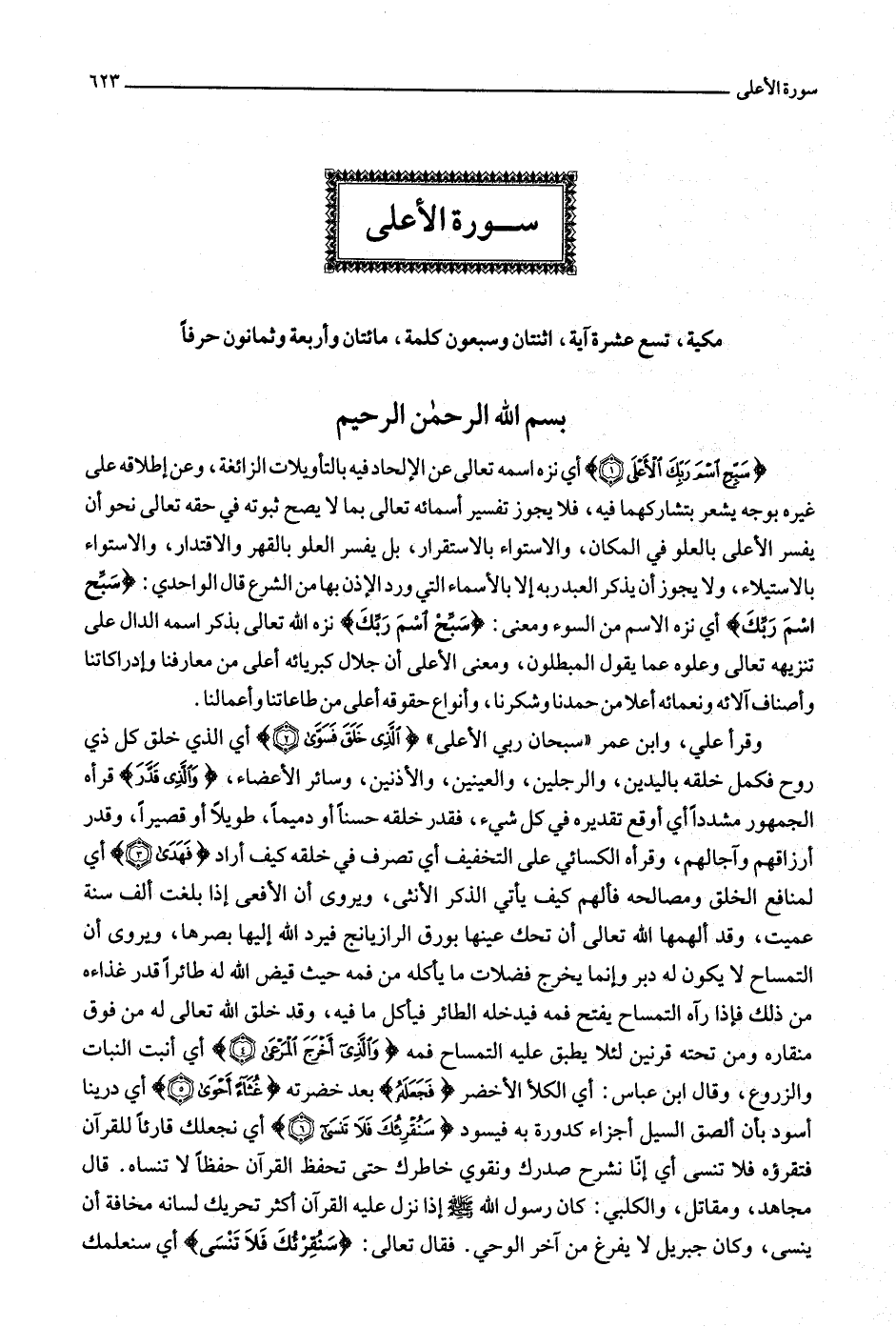سَبِّحِ اسْمَ رَبِّكَ الْأَعْلَى (1) أي نزه اسمه تعالى عن الإلحاد فيه بالتأويلات الزائغة، وعن إطلاقه على غيره بوجه يشعر بتشاركهما فيه، فلا يجوز تفسير أسمائه تعالى بما لا يصح ثبوته في حقه تعالى نحو أن يفسر الأعلى بالعلو في المكان، والاستواء بالاستقرار، بل يفسر العلو بالقهر والاقتدار، والاستواء بالاستيلاء، ولا يجوز أن يذكر العبد ربه إلا بالأسماء التي ورد الإذن بها من الشرع قال الواحدي: سَبِّحِ اسْمَ رَبِّكَ أي نزه الاسم من السوء ومعنى: سَبِّحِ اسْمَ رَبِّكَ نزه الله تعالى بذكر اسمه الدال على تنزيهه تعالى وعلوه عما يقول المبطلون، ومعنى الأعلى أن جلال كبريائه أعلى من معارفنا وإدراكاتنا وأصناف آلائه ونعمائه أعلا من حمدنا وشكرنا، وأنواع حقوقه أعلى من طاعاتنا وأعمالنا.