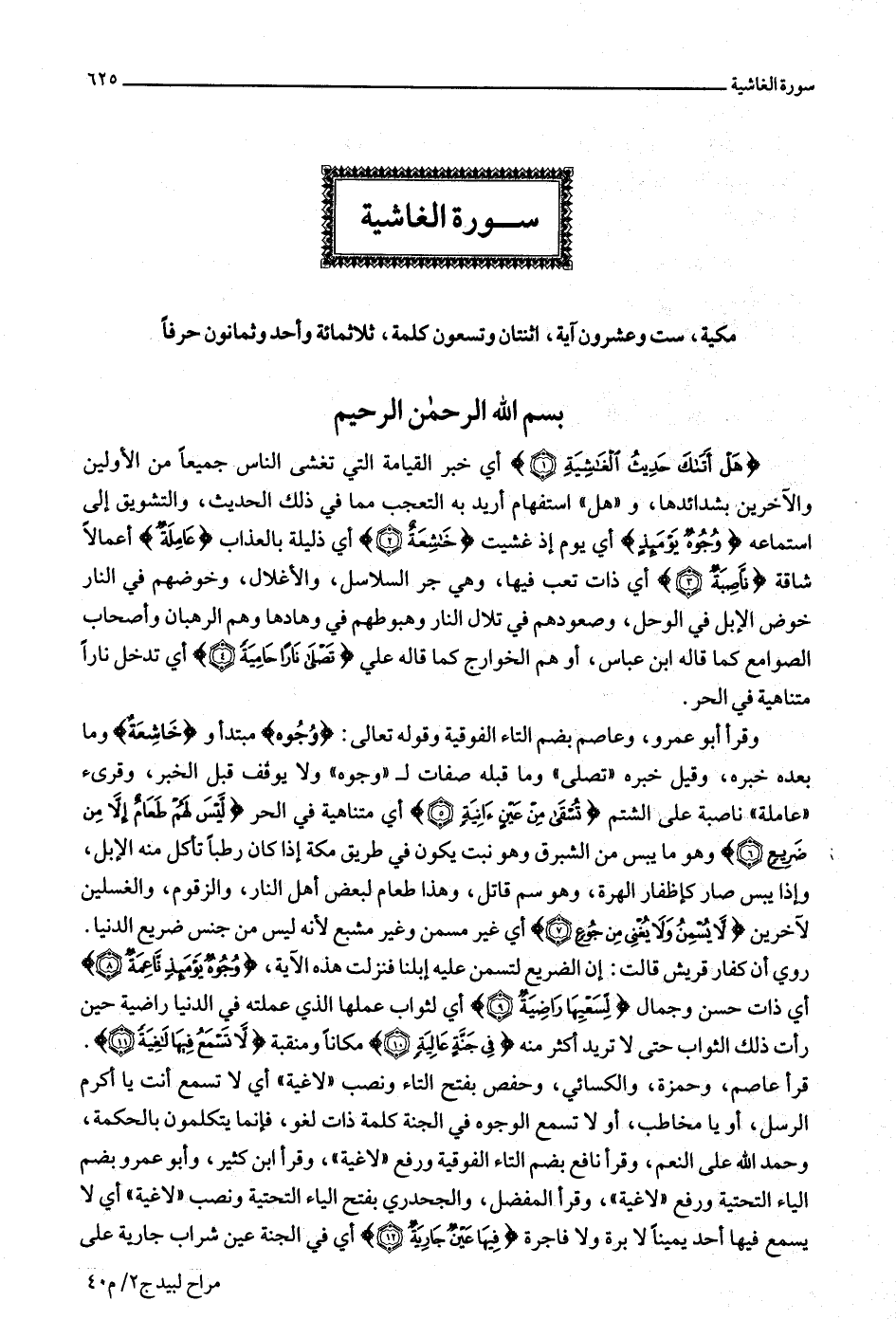هَلْ أَتاكَ حَدِيثُ الْغاشِيَةِ (1) أي خبر القيامة التي تغشى الناس جميعا من الأولين والآخرين بشدائدها، و «هل» استفهام أريد به التعجب مما في ذلك الحديث، والتشويق إلى استماعه وُجُوهٌ يَوْمَئِذٍ أي يوم إذ غشيت خاشِعَةٌ (2) أي ذليلة بالعذاب عامِلَةٌ أعمالا شاقة ناصِبَةٌ (3) أي ذات تعب فيها، وهي جر السلاسل، والأغلال، وخوضهم في النار خوض الإبل في الوحل، وصعودهم في تلال النار وهبوطهم في وهادها وهم الرهبان وأصحاب الصوامع كما قاله ابن عباس، أو هم الخوارج كما قاله علي تَصْلى ناراً حامِيَةً (4) أي تدخل نارا متناهية في الحر.