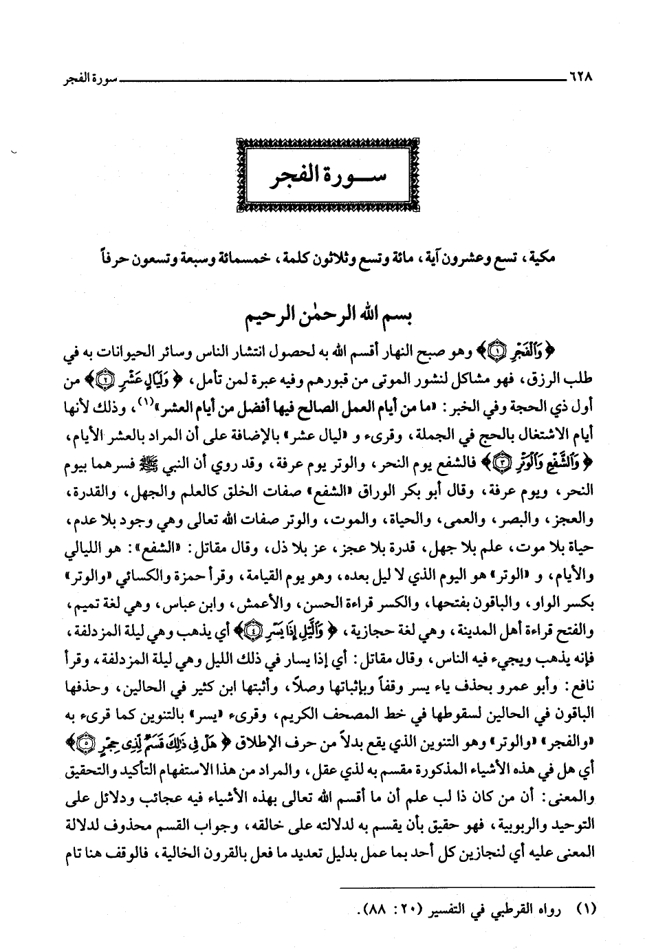 وَالْفَجْرِ (1) وهو صبح النهار أقسم الله به لحصول انتشار الناس وسائر الحيوانات به في طلب الرزق، فهو مشاكل لنشور الموتى من قبورهم وفيه عبرة لمن تأمل، وَلَيالٍ عَشْرٍ (2) من أول ذي الحجة