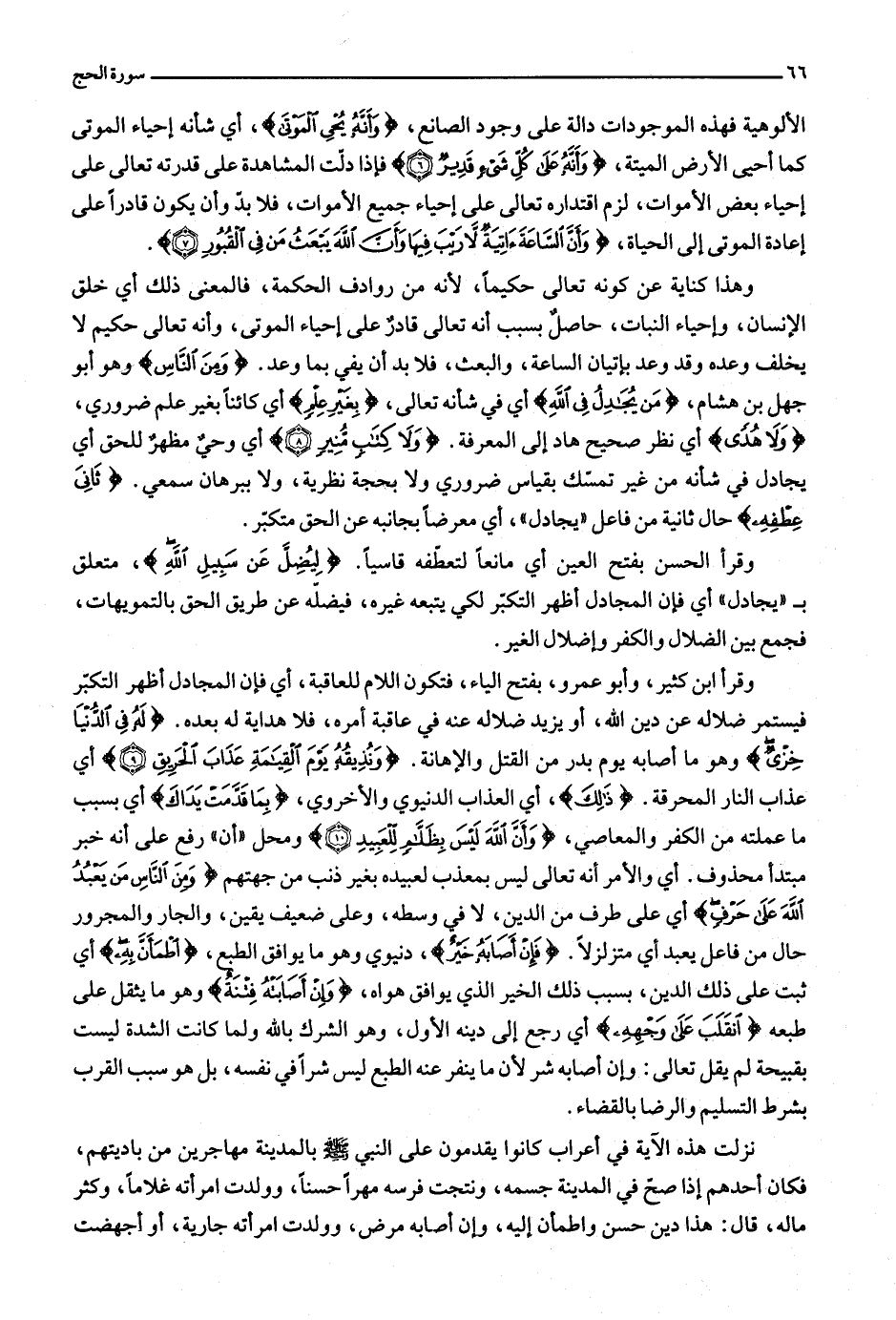 وهذا كناية عن كونه تعالى حكيما، لأنه من روادف الحكمة، فالمعنى ذلك أي خلق الإنسان، وإحياء النبات، حاصل بسبب أنه تعالى قادر على إحياء الموتى، وأنه تعالى حكيم لا يخلف وعده وقد وعد بإتيان الساعة، والبعث، فلا بد أن يفي بما وعد. وَمِنَ النَّاسِ وهو أبو جهل بن هشام، مَنْ يُجادِلُ فِي اللَّهِ أي في شأنه تعالى، بِغَيْرِ عِلْمٍ أي كائنا بغير علم ضروري، وَلا هُدىً أي نظر صحيح هاد إلى المعرفة. وَلا كِتابٍ مُنِيرٍ (8) أي وحي مظهر للحق أي يجادل في شأنه من غير تمسّك بقياس ضروري ولا بحجة نظرية، ولا ببرهان سمعي. ثانِيَ عِطْفِهِ حال ثانية من فاعل «يجادل» ، أي معرضا بجانبه عن الحق متكبّر.