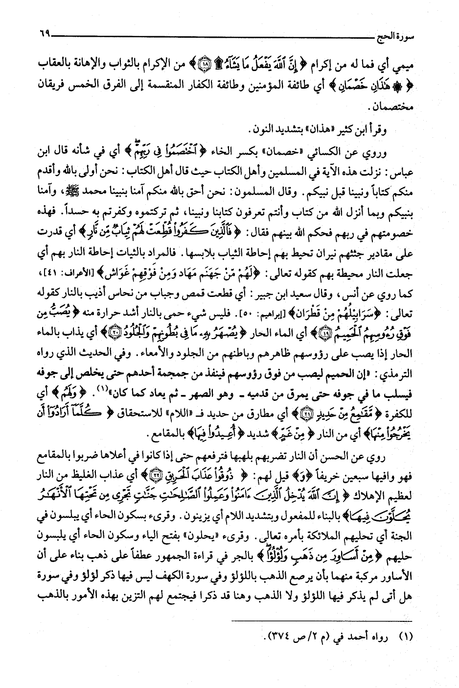 وروي عن الكسائي «خصمان» بكسر الخاء اخْتَصَمُوا فِي رَبِّهِمْ أي في شأنه قال ابن عباس: نزلت هذه الآية في المسلمين وأهل الكتاب حيث قال أهل الكتاب: نحن أولى بالله وأقدم منكم كتابا ونبينا قبل نبيكم. وقال المسلمون: نحن أحق بالله منكم آمنا بنبينا محمد صلّى الله عليه وسلّم، وآمنا بنبيكم وبما أنزل الله من كتاب وأنتم تعرفون كتابنا ونبينا، ثم تركتموه وكفرتم به حسدا. فهذه خصومتهم في ربهم فحكم الله بينهم فقال: فَالَّذِينَ كَفَرُوا قُطِّعَتْ لَهُمْ ثِيابٌ مِنْ نارٍ أي قدرت على مقادير جثثهم نيران تحيط بهم إحاطة الثياب بلابسها. فالمراد بالثياب إحاطة النار بهم أي جعلت النار محيطة بهم كقوله تعالى: لَهُمْ مِنْ جَهَنَّمَ مِهادٌ وَمِنْ فَوْقِهِمْ غَواشٍ [الأعراف: 41] ، كما روي عن أنس، وقال سعيد ابن جبير: أي قطعت قمص وجباب من نحاس أذيب بالنار كقوله تعالى: سَرابِيلُهُمْ مِنْ قَطِرانٍ [إبراهيم: 50] . فليس شيء حمى بالنار أشد حرارة منه يُصَبُّ مِنْ فَوْقِ رُؤُسِهِمُ الْحَمِيمُ (19) أي الماء الحار يُصْهَرُ بِهِ ما فِي بُطُونِهِمْ وَالْجُلُودُ (20) أي يذاب بالماء الحار إذا يصب على رؤوسهم ظاهرهم وباطنهم من الجلود والأمعاء.