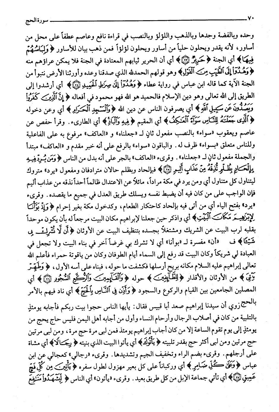 وحده وبالفضة وحدها وبالذهب واللؤلؤ وبالنصب في قراءة نافع وعاصم عطفا على محل من أساور، لأنه يقدر ويحلون حليا من أساور ويحلون لؤلؤا فمن ذهب بيان للأساور وَلِباسُهُمْ فِيها أي الجنة حَرِيرٌ (23) أي أن الحرير ثيابهم المعتادة في الجنة فلا يمكن عراؤهم منه وَهُدُوا إِلَى الطَّيِّبِ مِنَ الْقَوْلِ وهو قولهم الحمد لله الذي صدقنا وعده وأورثنا الأرض نتبوأ من الجنة الآية كما قاله ابن عباس في رواية عطاء وَهُدُوا إِلى صِراطِ الْحَمِيدِ (24) أي أرشدوا إلى الطريق إلى الله تعالى وهو دين الإسلام فالحميد هو الله فهو محمود في أفعاله إِنَّ الَّذِينَ كَفَرُوا وَيَصُدُّونَ عَنْ سَبِيلِ اللَّهِ أي يصرفون الناس عن دين الله وَالْمَسْجِدِ الْحَرامِ أي وعن دخوله الَّذِي جَعَلْناهُ لِلنَّاسِ سَواءً الْعاكِفُ أي المقيم فِيهِ وَالْبادِ أي الطارئ. وقرأ حفص عن عاصم ويعقوب «سواء» بالنصب مفعول ثان ل «جعلناه» و «العاكف» مرفوع به على الفاعلية وللناس متعلق «بسواء» ظرف له. والباقون «سواء» بالرفع على أنه خبر مقدم و «العاكف» مبتدأ والجملة مفعول ثان ل «جعلناه» . وقرئ «العاكف» بالجر على أنه بدل من الناس وَمَنْ يُرِدْ فِيهِ بِإِلْحادٍ بِظُلْمٍ نُذِقْهُ مِنْ عَذابٍ أَلِيمٍ (25) فبإلحاد وبظلم حالان مترادفان ومفعول «يرد» متروك ليتناول كل متناول أي ومن يرد في مكة مرادا، مائلا عن الاعتدال ظالما أحدا نذقه من عذاب أليم فإن الواجب على من كان فيه أن يضبط نفسه ويسلك طريق العدل في جميع ما يقصده. وقرئ «يرد» بفتح الياء أي من أتى فيه بإلحاد كاحتكار الطعام، وكدخول مكة بغير إحرام وَإِذْ بَوَّأْنا لِإِبْراهِيمَ مَكانَ الْبَيْتِ أي واذكر حين جعلنا لإبراهيم مكان البيت مرجعا له بأن يكون موحدا بقلبه لرب البيت عن الشريك ومشتغلا بجسده بتنظيف البيت عن الأوثان أَنْ لا تُشْرِكْ بِي شَيْئاً ف «أن» مفسرة ل «بوأنا» أي لا تشرك بي غرضا آخر في بناء البيت ولا تجعل في العبادة لي شريكا وكان البيت قد رفع إلى السماء أيام الطوفان وكان من ياقوتة حمراء فأعلم الله تعالى إبراهيم عليه السلام مكانه بريح أرسلها فكشفت ما حوله، فبناه على أسه الأول، وَطَهِّرْ بَيْتِيَ من الأوثان والأقذار لِلطَّائِفِينَ حوله وَالْقائِمِينَ وَالرُّكَّعِ السُّجُودِ (26) أي المصلين الجامعين بين القيام والركوع والسجود وَأَذِّنْ فِي النَّاسِ بِالْحَجِّ أي ناد فيهم بالأمر بالحج زوي أن سيدنا إبراهيم صعد أبا قبيس فقال: يا أيها الناس حجوا بيت ربكم فأجابه يومئذ بالتلبية من كان في أصلاب الرجال وأرحام النساء وأول من أجابه أهل اليمن فليس حاج يحج من يومئذ إلى يوم تقوم الساعة إلا من كان أجاب إبراهيم يومئذ فمن لبى مرة حج مرة، ومن لبى مرتين حج مرتين ومن لبى أكثر حج بقدر تلبيته يَأْتُوكَ أي يأتوا البيت الذي بنيته رِجالًا أي مشاة على أرجلهم. وقرئ بضم الراء وتخفيف الجيم وتشديدها. وقرئ «رجالي» كعجالي عن ابن عباس وَعَلى كُلِّ ضامِرٍ أي وركبانا على كل بعير مهزول لطول سفره يَأْتِينَ مِنْ كُلِّ فَجٍّ عَمِيقٍ (27) أي تأتي جماعة الإبل من كل طريق بعيد. وقرئ «يأتون» أي الناس لِيَشْهَدُوا مَنافِعَ