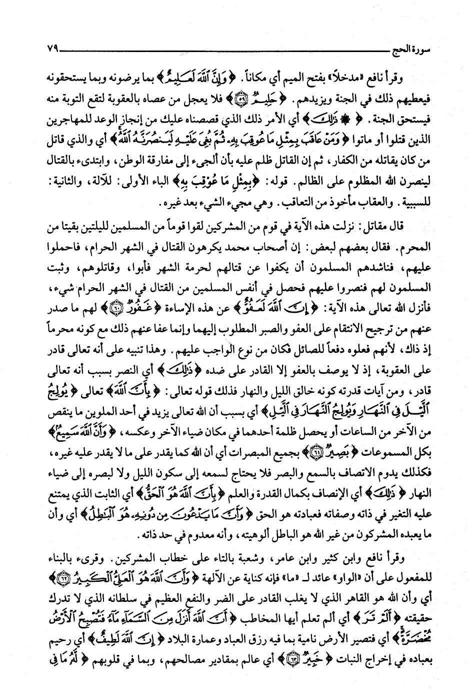 وقرأ نافع «مدخلا» بفتح الميم أي مكانا. وَإِنَّ اللَّهَ لَعَلِيمٌ بما يرضونه وبما يستحقونه فيعطيهم ذلك في الجنة ويزيدهم. حَلِيمٌ (59) فلا يعجل من عصاه بالعقوبة لتقع التوبة منه فيستحق الجنة. ذلِكَ أي الأمر ذلك الذي قصصناه عليك من إنجاز الوعد للمهاجرين الذين قتلوا أو ماتوا وَمَنْ عاقَبَ بِمِثْلِ ما عُوقِبَ بِهِ ثُمَّ بُغِيَ عَلَيْهِ لَيَنْصُرَنَّهُ اللَّهُ أي والذي قاتل من كان يقاتله من الكفار، ثم إن القاتل ظلم عليه بأن ألجئ إلى مفارقة الوطن، وابتدئ بالقتال لينصرن الله المظلوم على الظالم. قوله: بِمِثْلِ ما عُوقِبَ بِهِ الباء الأولى: للآلة، والثانية: