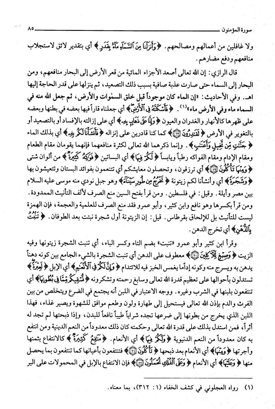 قال الرازي: إن الله تعالى أصعد الأجزاء المائية من قعر الأرض إلى البحار منافعهم، ومن البحار إلى السماء حتى صارت عذبة صافية بسبب ذلك التصعيد، ثم ينزلها على قدر الحاجة إليها اه-. وفي الأحاديث: «إن الماء كان موجودا قبل خلق السموات والأرض، ثم جعل الله منه في السماء ماء وفي الأرض ماء» «1» . فَأَسْكَنَّاهُ فِي الْأَرْضِ أي جعلناه قارا فيها بعضه في بطنها وبعضه على ظهرها كالأنهار والغدران والعيون وَإِنَّا عَلى ذَهابٍ بِهِ أي على إزالته بالإفساد أو بالتصعيد أو بالتغوير في الأرض لَقادِرُونَ (18) كما كنا قادرين على إنزاله فَأَنْشَأْنا لَكُمْ بِهِ أي بذلك الماء جَنَّاتٍ مِنْ نَخِيلٍ وَأَعْنابٍ. وإنما ذكرهما الله تعالى لكثرة منافعهما فإنهما يقومان مقام الطعام ومقام الإدام ومقام الفواكه رطبا ويابسا لَكُمْ فِيها أي البساتين فَواكِهُ كَثِيرَةٌ من ألوان شتى وَمِنْها تَأْكُلُونَ (19) أي ترزقون، وتحصلون معايشكم أي تتنعمون بفوائد البستان وتتعيشون بها وَشَجَرَةً أي وأنشأنا لكم زيتونة تَخْرُجُ مِنْ طُورِ سَيْناءَ وهو جبل نودي منه موسى عليه السلام بين مصر وأيلة. وقيل: في فلسطين. ومن قرأ بفتح السين منع الصرف لألف التأنيث الممدودة.