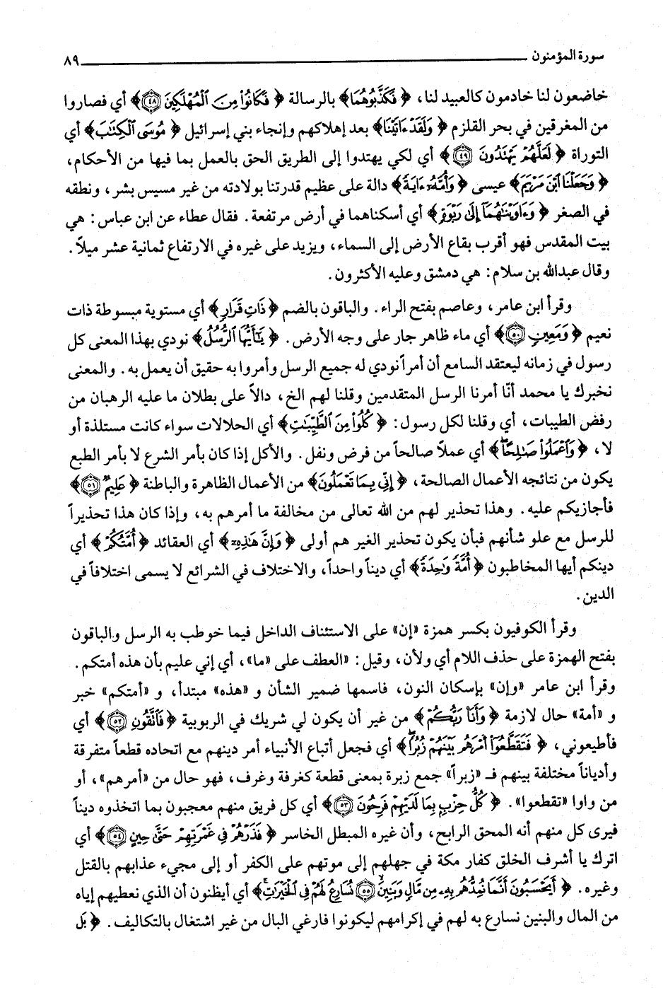 خاضعون لنا خادمون كالعبيد لنا، فَكَذَّبُوهُما بالرسالة فَكانُوا مِنَ الْمُهْلَكِينَ (48) أي فصاروا من المغرقين في بحر القلزم وَلَقَدْ آتَيْنا بعد إهلاكهم وإنجاء بني إسرائيل مُوسَى الْكِتابَ أي التوراة لَعَلَّهُمْ يَهْتَدُونَ (49) أي لكي يهتدوا إلى الطريق الحق بالعمل بما فيها من الأحكام، وَجَعَلْنَا ابْنَ مَرْيَمَ عيسى وَأُمَّهُ آيَةً دالة على عظيم قدرتنا بولادته من غير مسيس بشر، ونطقه في الصغر وَآوَيْناهُما إِلى رَبْوَةٍ أي أسكناهما في أرض مرتفعة. فقال عطاء عن ابن عباس: هي بيت المقدس فهو أقرب بقاع الأرض إلى السماء، ويزيد على غيره في الارتفاع ثمانية عشر ميلا.