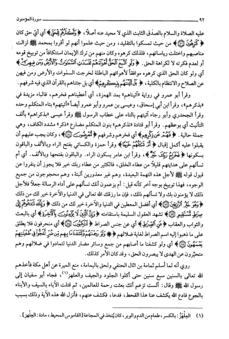 وقرأ أبو عمرو في رواية «آتيناهم» بمد الهمزة، أي أعطيناهم فخرهم، فالباء مزيدة في «بذكرهم» ، وقرأ ابن أبي إسحاق، وعيسى بن عمرو وأبو عمرو أيضا «أتيتهم» بتاء المتكلم وحده وقرأ الجحدري وأبو رجاء آتيتهم بالتاء على خطاب الرسول صلّى الله عليه وسلّم وقرأ عيسى «بذكراهم» بألف التأنيث أي بوعظهم. وقرأ أبو قتادة «نذكرهم» بنون المتكلم مضارع «ذكر» مشدد الكاف، وهي جملة حالية. فَهُمْ عَنْ ذِكْرِهِمْ أي فخرهم وشرفهم مُعْرِضُونَ (71) ، وكان يجب عليهم أن يقبلوا عليه أكمل إقبال أَمْ تَسْأَلُهُمْ خَرْجاً وقرأ حمزة والكسائي بفتح الراء وبالألف والباقون بسكونها فَخَراجُ رَبِّكَ خَيْرٌ، وقرأ ابن عامر بسكون الراء. والباقون بفتحها وبالألف. أي أم تسألهم على هدايتهم قليلا من عطاء الخلق، فالكثير من عطاء ربك خير فلا يجوز أن ينفروا عن قبول قوله صلّى الله عليه وسلّم لأجل هذه التهمة البعيدة، وهم غير معذورين ألبتة، وهم محجوجون من جميع الوجوه، فهذا توبيخ بوجه آخر كأنه قيل: أم يزعمون أنك تسألهم على أداء الرسالة جعلا فلأجل ذلك لا يؤمنون بك ولا تسألهم ذلك، فإن ما رزقك الله تعالى في الدنيا والآخرة خير لك من ذلك وَهُوَ خَيْرُ الرَّازِقِينَ (72) أي أفضل المعطين في الدنيا والآخرة خير لك من ذلك وَإِنَّكَ لَتَدْعُوهُمْ إِلى صِراطٍ مُسْتَقِيمٍ (73) تشهد العقول السليمة باستقامته وَإِنَّ الَّذِينَ لا يُؤْمِنُونَ بِالْآخِرَةِ أي بالبعث والثواب والعقاب عَنِ الصِّراطِ أي عن جنس الصراط لَناكِبُونَ (74) أي منحرفون فلا يطلق على ما ذهبوا إليه اسم الصراط لغاية ضلالهم وَلَوْ رَحِمْناهُمْ وَكَشَفْنا ما بِهِمْ مِنْ ضُرٍّ لَلَجُّوا فِي طُغْيانِهِمْ يَعْمَهُونَ (75) أي ولو كشفنا ما أصابهم من جمع وسائر مضار الدنيا لتمادوا في ضلالهم وهم متحيّرون عن الهدى لا يبصرون الحق، وقد كان الأمر كذلك.