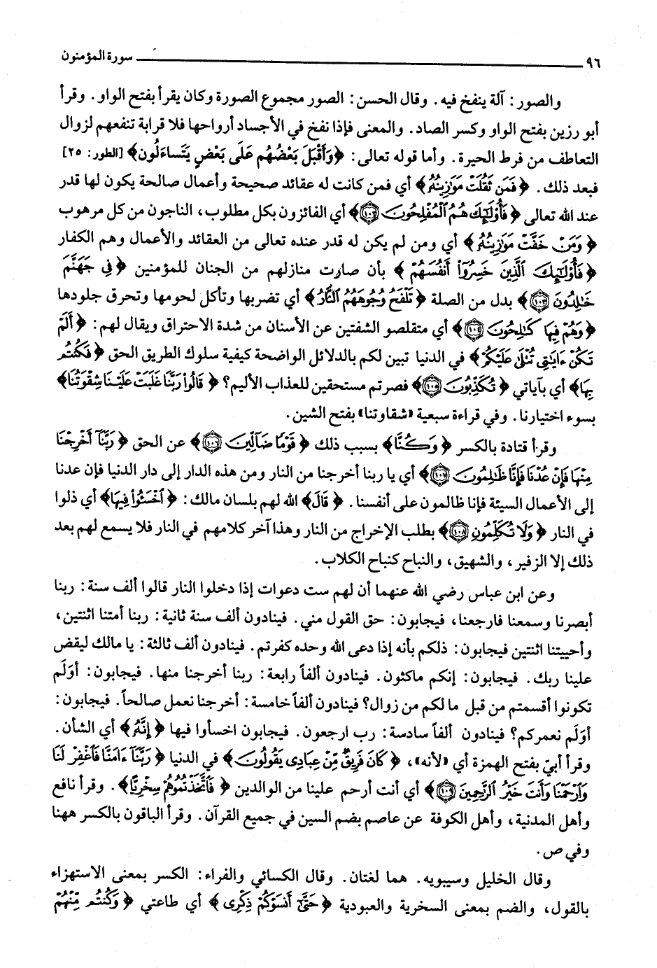 والصور: آلة ينفخ فيه. وقال الحسن: الصور مجموع الصورة وكان يقرأ بفتح الواو. وقرأ أبو رزين بفتح الواو وكسر الصاد. والمعنى فإذا نفخ في الأجساد أرواحها فلا قرابة تنفعهم لزوال التعاطف من فرط الحيرة. وأما قوله تعالى: وَأَقْبَلَ بَعْضُهُمْ عَلى بَعْضٍ يَتَساءَلُونَ [الطور: 25] فبعد ذلك. فَمَنْ ثَقُلَتْ مَوازِينُهُ أي فمن كانت له عقائد صحيحة وأعمال صالحة يكون لها قدر عند الله تعالى فَأُولئِكَ هُمُ الْمُفْلِحُونَ (102) أي الفائزون بكل مطلوب، الناجون من كل مرهوب وَمَنْ خَفَّتْ مَوازِينُهُ أي ومن لم يكن له قدر عنده تعالى من العقائد والأعمال وهم الكفار فَأُولئِكَ الَّذِينَ خَسِرُوا أَنْفُسَهُمْ بأن صارت منازلهم من الجنان للمؤمنين فِي جَهَنَّمَ خالِدُونَ (103) بدل من الصلة تَلْفَحُ وُجُوهَهُمُ النَّارُ أي تضربها وتأكل لحومها وتحرق جلودها وَهُمْ فِيها كالِحُونَ (104) أي متقلصو الشفتين عن الأسنان من شدة الاحتراق ويقال لهم: أَلَمْ تَكُنْ آياتِي تُتْلى عَلَيْكُمْ في الدنيا تبين لكم بالدلائل الواضحة كيفية سلوك الطريق الحق فَكُنْتُمْ بِها أي بآياتي تُكَذِّبُونَ (105) فصرتم مستحقين للعذاب الأليم؟ قالُوا رَبَّنا غَلَبَتْ عَلَيْنا شِقْوَتُنا بسوء اختيارنا. وفي قراءة سبعية «شقاوتنا» بفتح الشين.