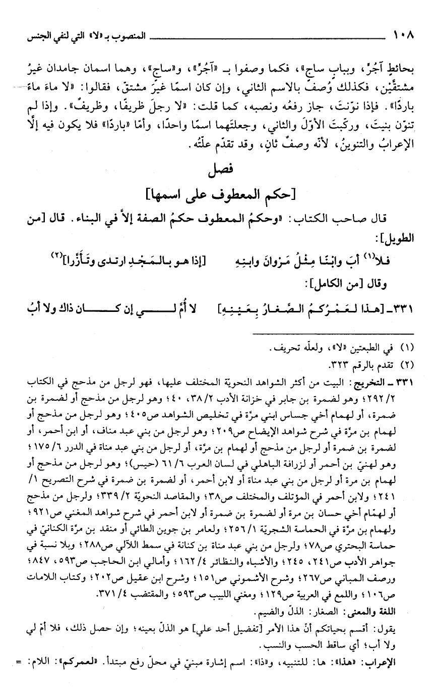 331 - التخريج: البيت من أكثر الشواهد النحويّة المختلف عليها، فهو لرجل من مذحج في الكتاب 2/ 292؛ وهو لضمرة بن جابر في خزانة الأدب 2/ 38، 40؛ وهو لرجل من مذحج أو لضمرة بن ضمرة، أو لهمام أخي جساس ابني مرَّة في تخليص الشواهد ص 405؛ وهو لرجل من مذحج أو لهمام بن مرة في شرح شواهد الإيضاح ص 209؛ وهو لرجل من بني عبد مناف، أو ابن أحمر، أو لضمرة بن ضمرة أو لرجل من مذحج أو لهمام بن مرَّة، أو لرجل من بني عبد مناة في الدرر 6/ 175؛ وهو لهنيّ بن أحمر أو لزرافة الباهلي في لسان العرب 6/ 61 (حيس)؛ وهو لرجل من مذحج أو لهمام بن مرة أو لرجل من بني عبد مناة أو لابن أحمر، أو لضمرة بن ضمرة في شرح التصريح 1/ 241؛ ولابن أحمر في المؤتلف والمختلف ص 38؛ والمقاصد النحويّة 2/ 339؛ ولرجل من مذحج أو لهمّام أخي حسان بن مرة أو لضمرة بن ضمرة أو لابن أحمر في شرح شواهد المغني ص 921؛ ولهمام بن مرَّة في الحماسة الشجريّة 1/ 256؛ ولعامر بن جوين الطائي أو منقد بن مرَّة الكنانيّ في حماسة البحتري ص 78؛ ولرجل من بني عبد مناة بن كنانة في سمط اللآلي ص 288؛ وبلا نسبة في جواهر الأدب ص 241، 245؛ والأشباه والنظائر 4/ 162؛ وأمالي ابن الحاجب ص 593، 847؛ ورصف المباني ص 267؛ وشرح الأشموني ص 151؛ وشرح ابن عقيل ص 202؛ وكتاب اللامات ص 106؛ واللمع في العربية ص 129؛ ومغنى اللبيب ص 593؛ والمقتضب 4/ 371.