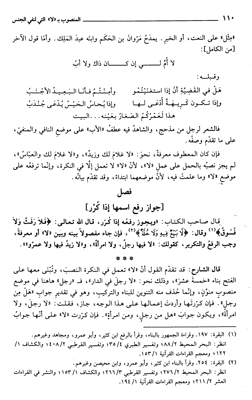 قال صاحب الكتاب: "ويجوز رفعه إذا كرر قال تعالى: {فلا رفث ولا فسوق} (¬1)، وقال: {لا بيع فيه ولا خلة} (¬2) , فإن جاء مفصولاً بينه وبين "لا" أو معرفة, وجب الرفع والتكرير, كقولك: "لا فيها رجلٌ ولا امرأة"، و"لا زيد فيها ولا عمرو""