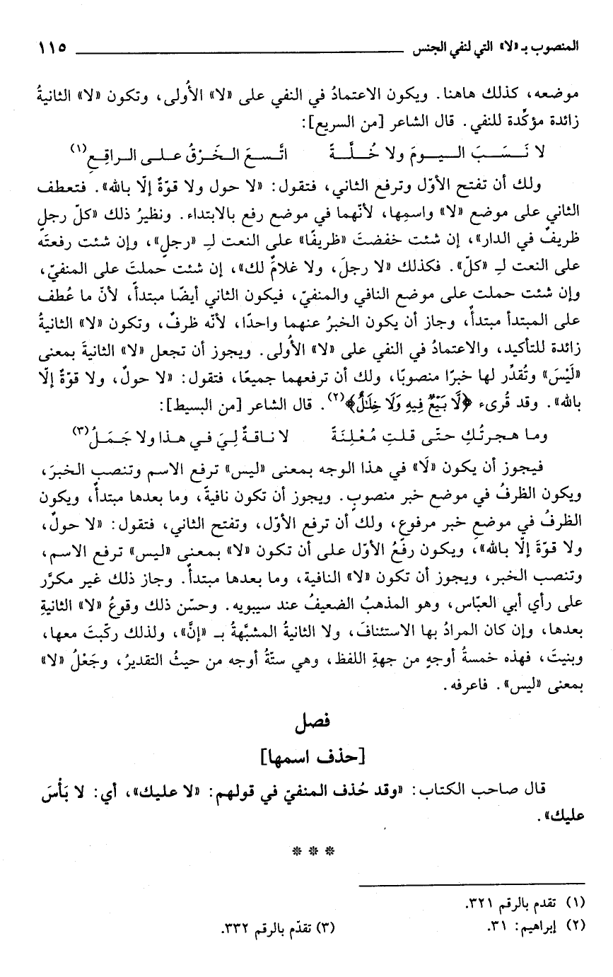 موضعه، كذلك ها هنا. ويكون الاعتمادُ في النفي على "لا" الأوُلى، وتكون "لا" الثانيةُ زائدة مؤكّدة للنفي. قال الشاعر [من السريع]: