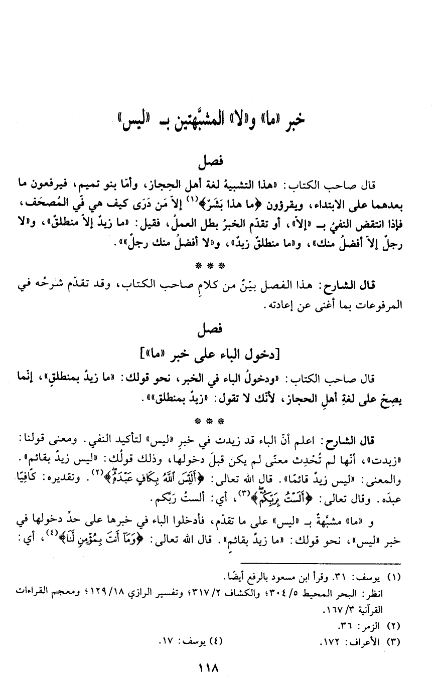 قال الشارح: اعلم أنّ الباء قد زيدت في خبرِ "ليس" لتأكيد النفي. ومعنى قولنا: "زيدت"، أنّها لم تُحْدِث معنًى لم يكن قبلَ دخولها، وذلك قولُك: "ليس زيدٌ بقائم". والمعنى: "ليس زيدٌ قائمًا". قال الله تعالى: {أَلَيْسَ اللَّهُ بِكَافٍ عَبْدَهُ} (¬2). وتقديره: كافِيًا عبدَه. وقال تعالى: {أَلَسْتُ بِرَبِّكُمْ} (¬3)، أي: ألستُ رَبَّكم.