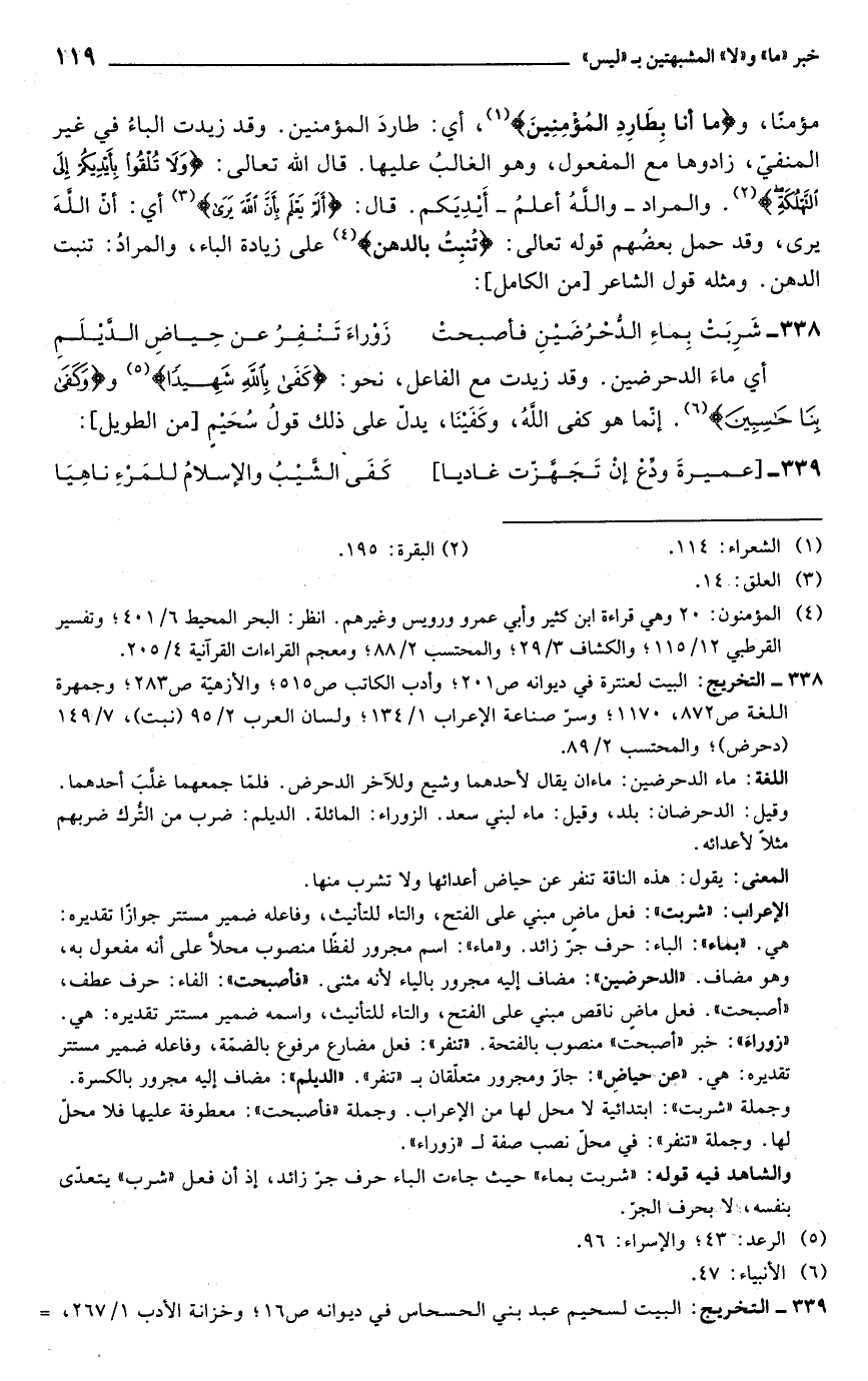 338 - التخريج: البيت لعنترة في ديوانه ص 201؛ وأدب الكاتب ص 515؛ والأزهيّة ص 283؛ وجمهرة اللغة ص 872, 1170؛ وسرّ صناعة الإعراب 1/ 134؛ ولسان العرب 2/ 95 (نبت)، 7/ 149 (دحرض)؛ والمحتسب 2/ 89.