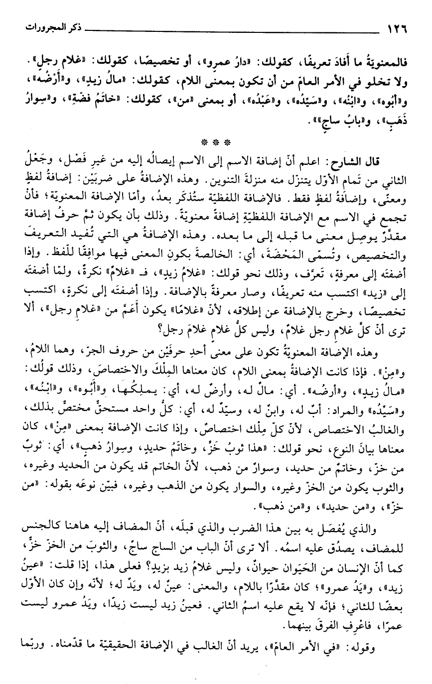 قال الشارح: اعلم أنّ إضافة الاسم إلى الاسم إيصالُه إليه من غيرِ فَصْل، وجَعْلُ الثاني من تَمامِ الأوّل يتنزّل منه منزلةَ التنوين. وهذه الإضافةُ على ضربَيْن: إضافةُ لفظٍ ومعنًى، وإضافةُ لفظٍ فقط. فالإضافة اللفظيّة ستُذكَر بعدُ، وأمّا الإضافة المعنويّة؛ فأنْ تجمع في الاسم مع الإضافة اللفظيّةِ إضافةً معنويّةً. وذلك بأن يكون ثمَّ حرفُ إضافة مقدَّرٌ يوصِل معنى ما قبله إلى ما بعده. وهذه الإضافةُ هي التي تُفيد التعريفَ والتخصيص، وتُسمّى المَحْضَةَ، أي: الخالصةَ بكونِ المعنى فيها موافِقًا للّفظ. وإذا أضفتَه إلى معرفةٍ، تَعرَّف، وذلك نحو قولك: "غلامُ زيدٍ"، فـ "غلامٌ" نكرةٌ، ولمّا أضفتَه إلى "زيد" اكتسب منه تعريفًا، وصار معرفةً بالإضافة. وإذا أضفتَه إلى نكرةٍ، اكتسب تخصيصًا، وخرج بالإضافة عن إطلاقه, لأنّ "غلامًا" يكون أَعَمَّ من "غلامِ رجل"، ألا ترى أنّ كلَّ غلامِ رجل غلامٌ، وليس كلُّ غلامٍ غلامَ رجل؟