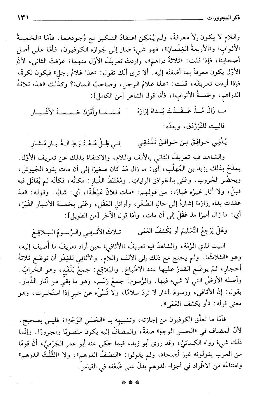 واللام لا يكون إلاّ معرفةً، ولم يُمْكِن اعتقادُ التنكير مع وُجودهما. فأمّا "الخمسةُ الأثوابِ" و"الأربعةُ الغِلْمانِ"، فهو شيءٌ صار إلى جَوازه الكوفيون، فأمّا على أصل أصحابنا، فإذا قلت: "ثلاثةُ دراهمَ"، وأردتَ تعريفَ الأوّل منهما؛ عرّفتَ الثاني, لأنّ الأوّل يكون معرفةٌ بما أضفتَه إليه. ألا ترى أنّك تقول: "هذا غلامُ رجلٍ" فيكون نكرةً، فإذا أردتَ تعريفَه، قلت: "هذا غلامُ الرجل، وصاحبُ المال"؟ وكذلك "هذه ثلاثةُ الدراهمِ، وخمسةُ الأثوابِ"، فأمّا قول الشاعر [من الكامل]: