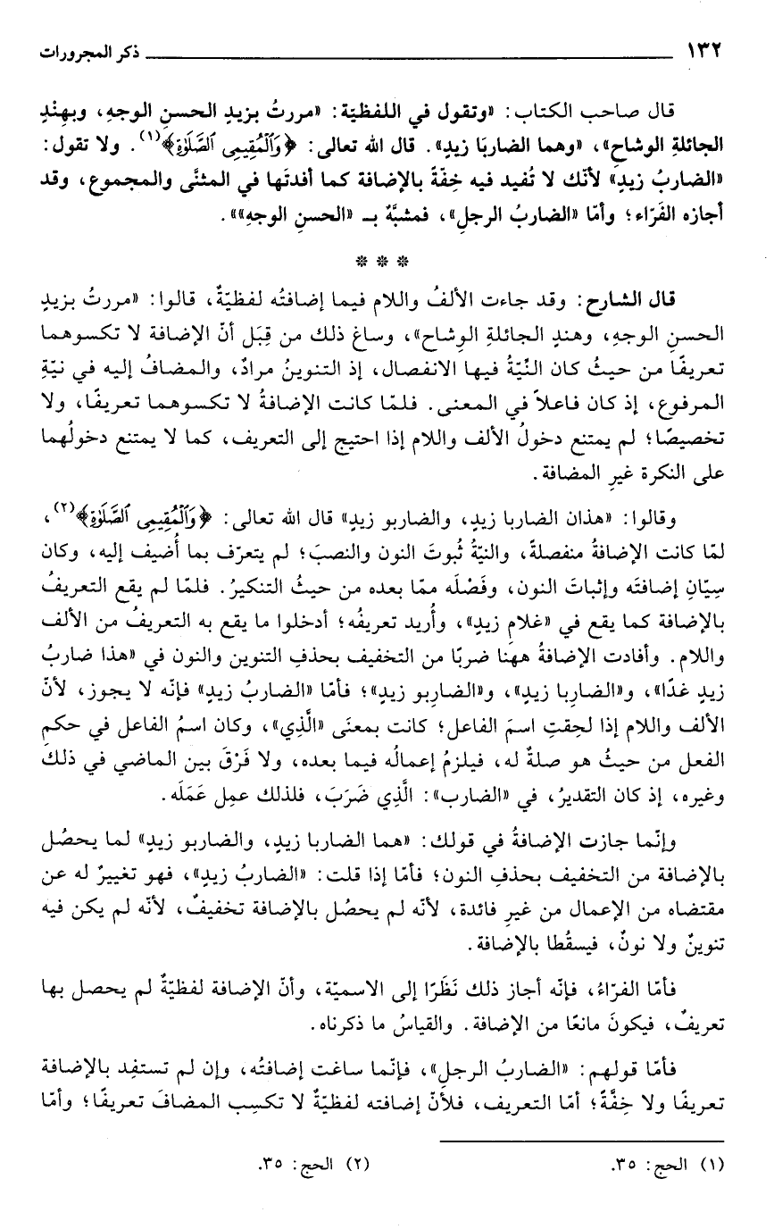 قال صاحب الكتاب: "وتقول في اللفظية مررت بزيد الحسن الوجه، وبهند الجائلة الوشاح، وهم الضاربا زيد. قال الله تعالى: {والمقيمي الصلاة} (¬1). ولا تقول الضارب زيد، لأنك لا تفيد فيه خفة بالإضافة كما أفدتها في المثنى والمجموع، وقد أجازه الفراء؛ وأما الضارب الرجل فمشبه بـ "الحسن الوجه"".