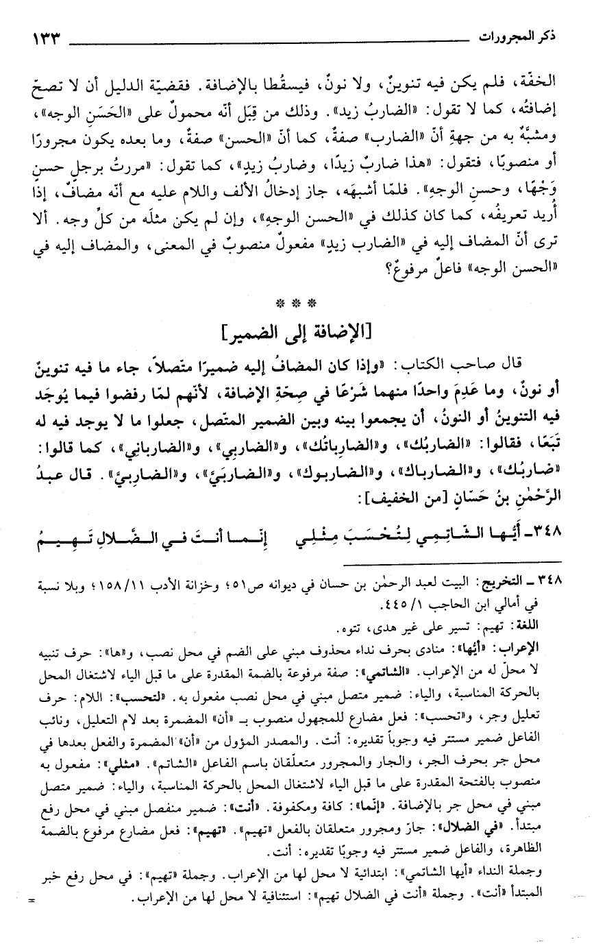 قال صاحب الكتاب: "وإذا كان المضاف إليه ضميراً متصلاً, جاء ما فيه تنوين أو نون وما عدم واحداً منهما شرعاً في صحة الإضافة, لأنهم لما رفضوا يوجد فيه التنوين أو النون أن يجمعوا بينه وبين الضمير المتصل جعلوا ما لا يوجد فيه له تبعاً فقالوا: "الضاربك" و"الضارباتك", و"الضاربي" ,"الضارباني، كما قالوا "ضارباك" و"الضارباك" و"الضاربوك" و"الضاربي", قال عبد الرحمن بن حسان [من الخفيف]: