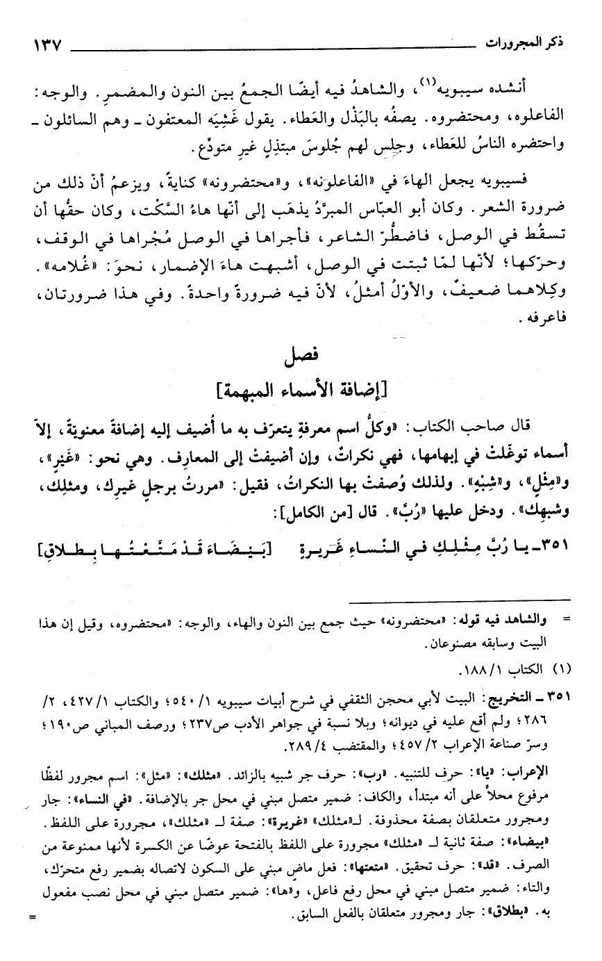 قال صاحب الكتاب: "وكل اسم معرفة يتعرف به ما أضيف إليه إضافة معنوية، إلا أسماء توغلت في إبهامها, فهي نكرات, وإن أضيفت إلى المعارف. وهي نحو: "غير", و"مثل" و"شبه". ولذلك وصفت بها النكرات, فقيل: "مررت برجل غيرك, ومثلك, وشبهك". ودخل عليها "رُبَّ". قال [من الكامل]:
