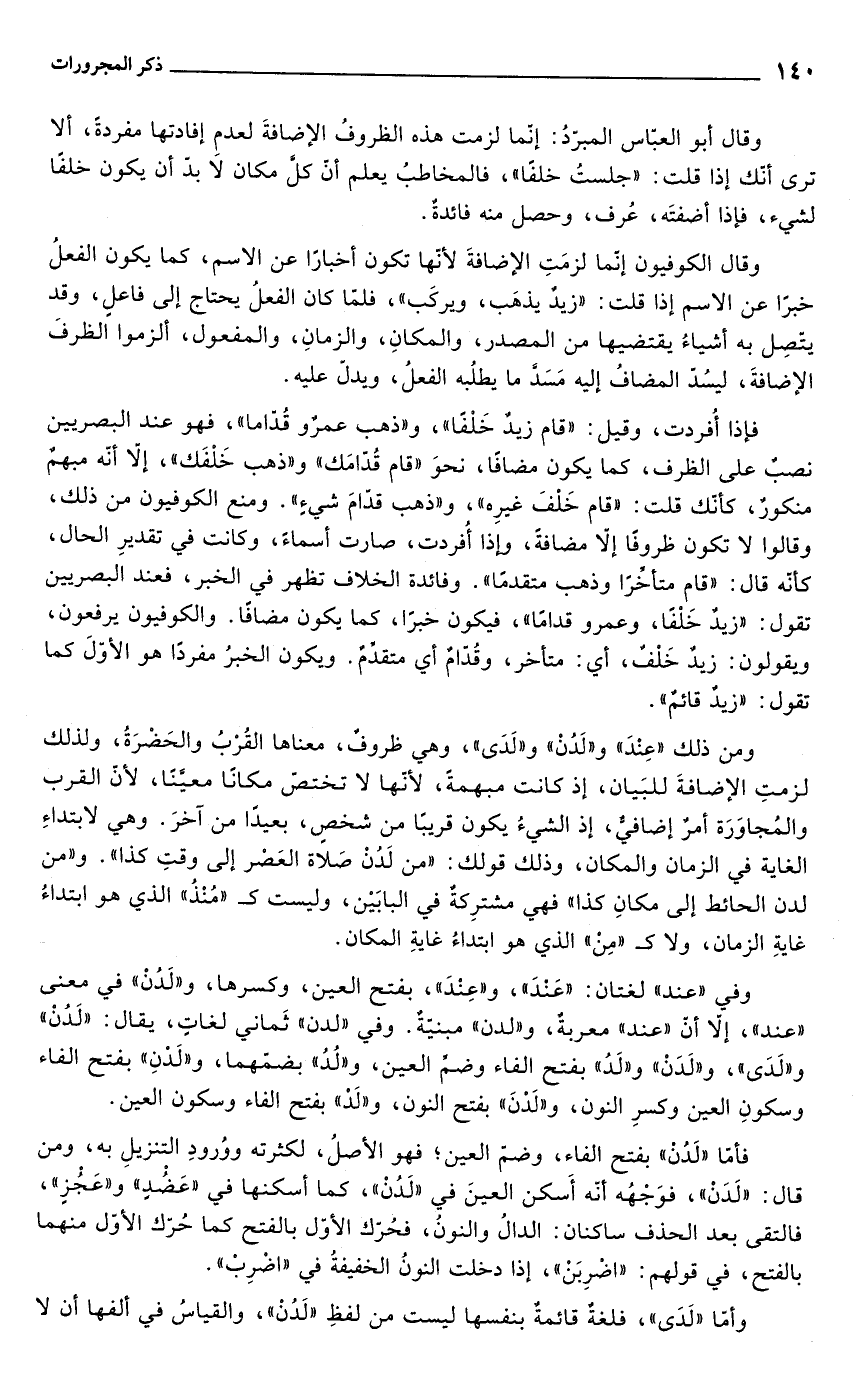 ومن ذلك "عِنْدَ" و"لَدُنْ" و"لَدَى"، وهي ظروفٌ، معناها القُرْبُ والحَضْرَةُ، ولذلك لزمتِ الإضافةَ للبَيان، إذ كانت مبهمةً، لأنّها لا تختصّ مكانًا معيَّنًا, لأنّ القرب والمُجاوَرَة أمرٌ إضافيٌّ، إذ الشيءُ يكون قريبًا من شخصٍ، بعيدًا من آخرَ. وهي لابتداءِ الغاية في الزمان والمكان، وذلك قولك: "من لَدُنْ صَلاة العَصْر إلى وقتِ كذا". و"من لدن الحائط إلى مكانِ كذا" فهي مشترِكةٌ في البابَيْن، وليست كـ "مُنْذُ" الذي هو ابتداءُ غايةِ الزمان، ولا كـ "مِنْ" الذي هو ابتداءُ غايةِ المكان.