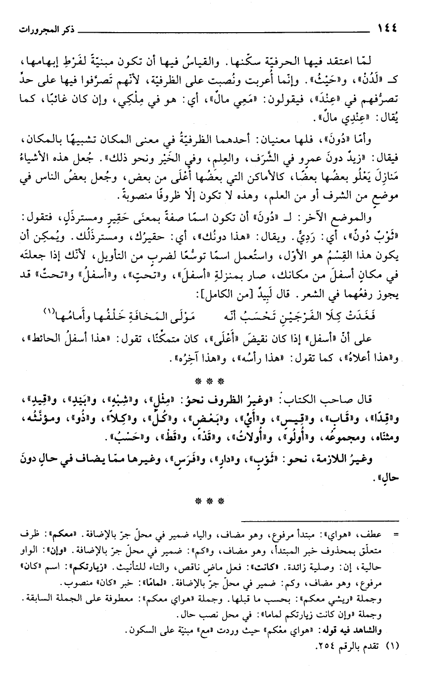 قال صاحب الكتاب: "وغير الظروف نحو: "مثل", و"شبه", و"بيدٍ", و"قيد", و"قداً", و"قاب", و"قيسٍ", و"أي", و"بعض", و"كل" و"كلا", و"ذو" ومؤنثه, ومثناه, و"مجموعه, و"أولو",و"أولات", و"قد" و"قط", و"حسب".