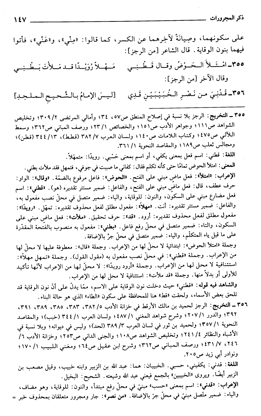 355 - التخريج: الرجز بلا نسبة في إصلاح المنطق ص 57، 34؛ وأمالي المرتضى 2/ 309؛ وتخليص الشواهد ص 111؛ وجواهر الأدب ص 151؛ والخصائص 1/ 23؛ ورصف المباني ص 362؛ وسمط اللآلي ص 475؛ وكتاب اللامات ص 140؛ ولسان العرب 7/ 382 (قطط)، 13/ 344 (قطن)؛ ومجالس ثعلب ص 189؛ والمقاصد النحوية 1/ 361.