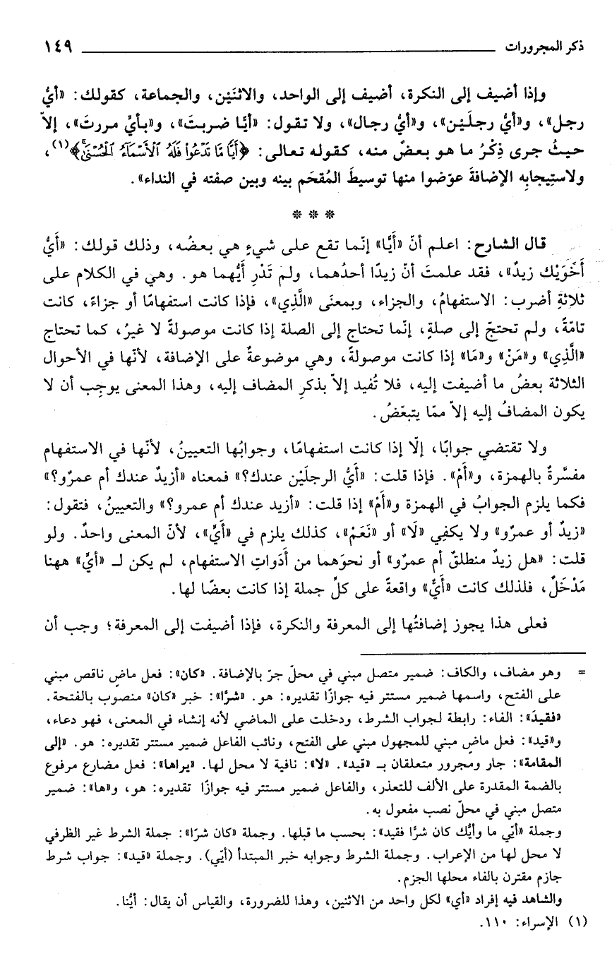 قال الشارح: اعلم أنّ "أَيًّا" إنّما تقع على شيءٍ هي بعضُه، وذلك قولك: "أَيُّ أَخَوَيْك زيدٌ"، فقد علمتَ أنّ زيدًا أحدُهما, ولم تَدْرِ أَيُّهما هو. وهي في الكلام على ثلاثةِ أضرب: الاستفهامُ، والجزاء، وبمعنَى "الَّذِي"، فإذا كانت استفهامًا أو جزاءً، كانت تامّةً، ولم تحتجّ إلى صلةٍ، إنّما تحتاج إلى الصلة إذا كانت موصولةً لا غيرُ، كما تحتاج "الذِي" و"مَنْ" و"مَا" إذا كانت موصولةً، وهي موضوعةٌ على الإضافة، لأنّها في الأحوال الثلاثة بعضُ ما أضيفت إليه، فلا تُفيد إلَّا بذكرِ المضاف إليه، وهذا المعنى يوجِب أن لا يكون المضافُ إليه إلَّا ممّا يتبعّضُ.