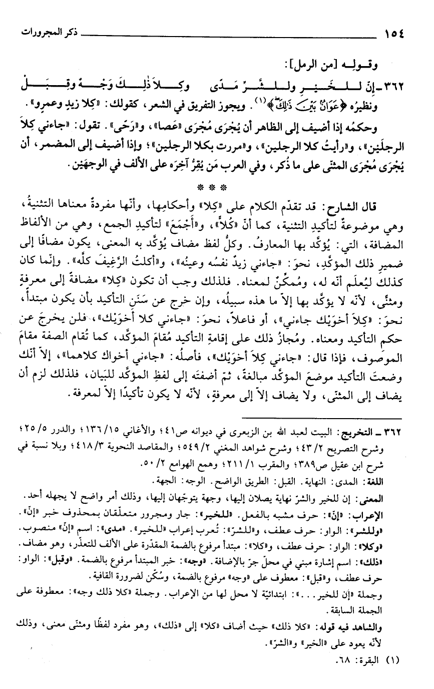 والشاهد فيه قوله: "كلا ذلك" حيث أضاف "كلا" إلى "ذلك"، وهو مفرد لفظًا ومثنّى معنى، وذلك لأنّه يعود على "الخير" و"الشرّ".