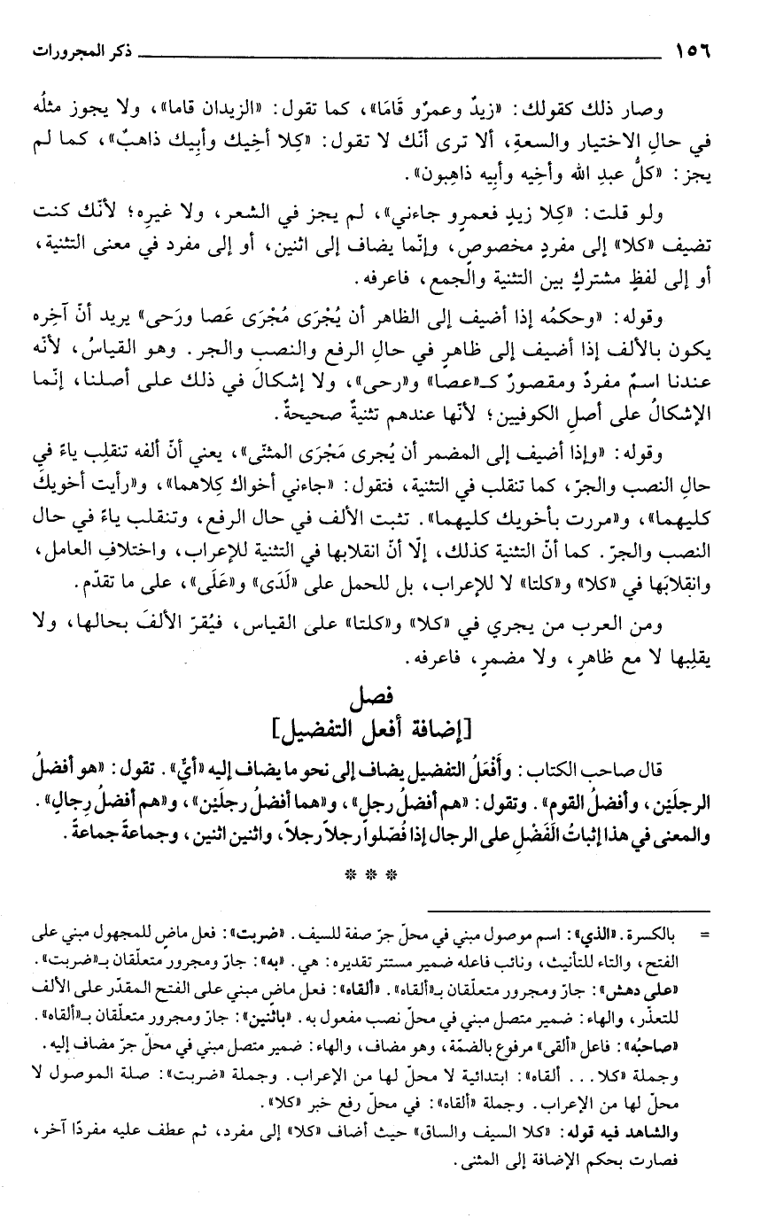 وقوله: "وحكمُه إذا أضيف إلى الظاهر أن يُجْرَى مُجْرَى عَصا ورَحى" يريد أنّ آخِره يكون بالألف إذا أضيف إلى ظاهرٍ في حالِ الرفع والنصب والجر. وهو القياسُ، لأنه عندنا اسمٌ مفردٌ ومقصورٌ كـ "عصا" و"رحى"، ولا إشكالَ في ذلك على أصلنا، إنما الإشكالُ على أصلِ الكوفيين؛ لأتها عندهم تثنية صحيحة.
