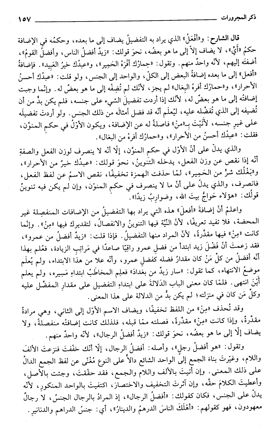 قال الشارح: و"أفْعَلُ" الذي يراد به التفضيلُ يضاف إلى ما بعده، وحكمُه في الإضافة حكمُ "أَيٍّ"، لا يضاف إلّا إلى ما هو بعضُه، نحوَ قولك: "زيدٌ أفضلُ الناس، وأفضلُ القومُ"، أضفتَه إليهم، لأنه واحدٌ منهم. وتقول: "حِمارُك أفْرَهُ الحَمِير"، و"عبدُك خيرُ العَبِيد". فإضافةُ "أفعل" إلى ما بعده إضافةُ البعض إلى الكل، والواحد إلى الجنس، ولو قلت: "عبدُك أحسنُ الأحرار"، و"حمارُك أفرهُ البِغال" لم يجز، لأئك لم تُضِفْه إلى ما هو بعضٌ له. وإنّما وجبت إضافتُه إلى ما هو بعضٌ له، لأنك إذا أردت تفضيلَ الشيء على جنسه، فلم يكن بدٌّ من أن تُضيفه إلى الذي تُفضِّله عليه، ليُعلَم أنّه قد فضل أمثالَه من ذلك الجنس. ولو أردتَ تفضيلَه على غيرِ جنسه، لأَتَيْتَ بِ "منْ " فاصلةَ له عن الإضافة، ويكون الأوّل في حكم المنوَّن، فقلت: "عبدُك أحسنُ من الأحرار"، و"حمارُك أفرهُ من البغال".