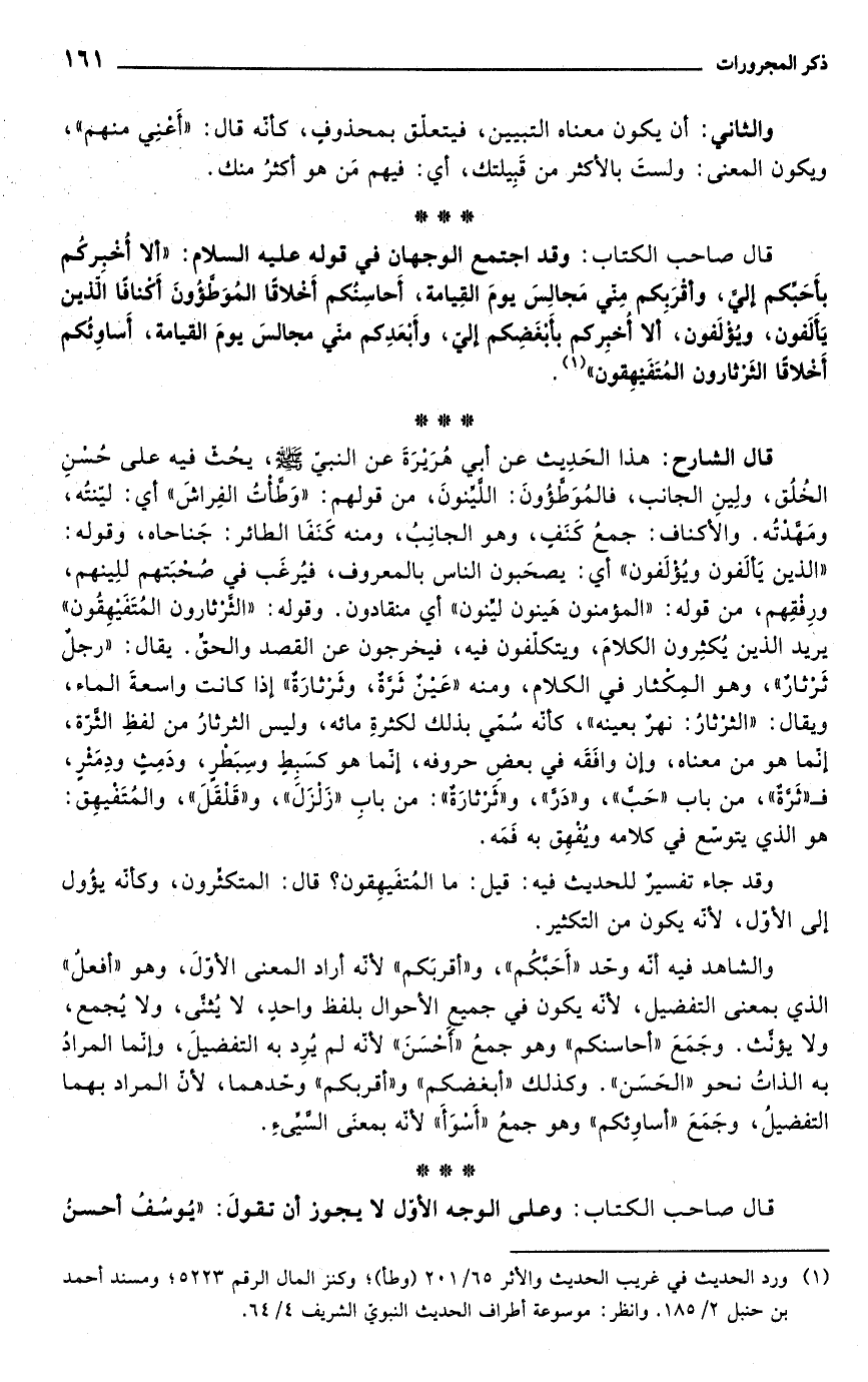 قال صاحب الكتاب: وقد اجتمع الوجهان في قوله عليه السلام:"ألا أخبركم بأحبكم إليَّ, وأقربكم مني مجالس يوم القيامة, أحاسنكم أخلاقًا الموطؤون أكنافاً الذين يألفون, ويؤلفون, ألا أخبركم بأبغضكم إليّ, وأبعدكم مني مجالس يوم القيامة, أساوئكم أخلاقاً الثرثارون المتفيهقون" (¬1).