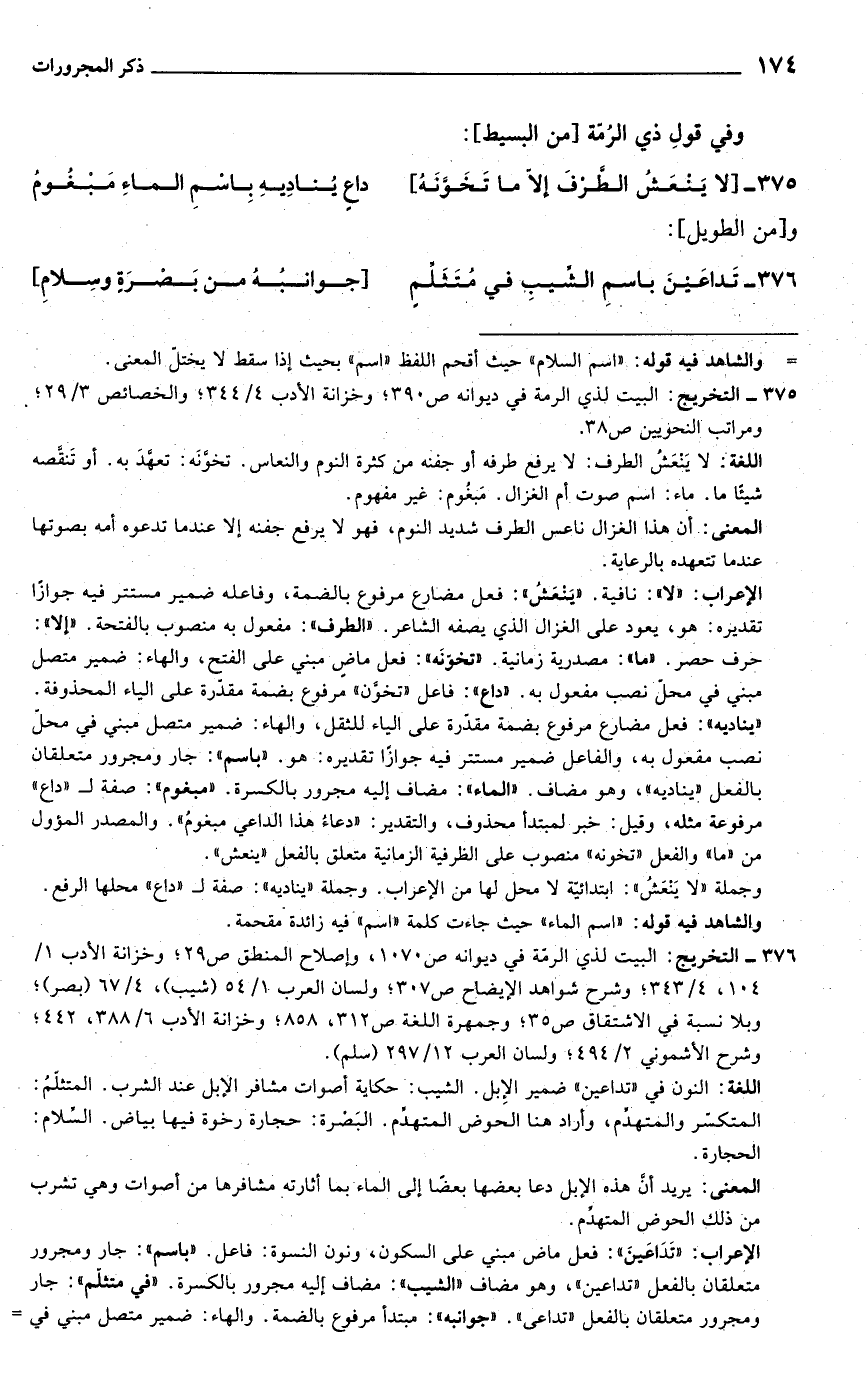 375 - التخريج: البيت لذي الرمة في ديوانه ص 390؛ وخزانة الأدب 4/ 344؛ والخصائص 3/ 29؛ ومراتب النحويين ص 38.