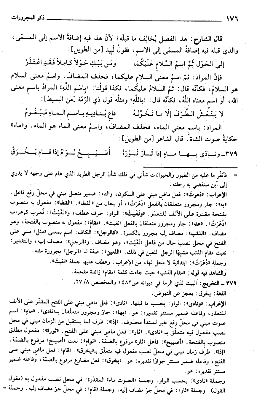 الإعراب: "ونادى": الواو: بحسب ما قبلها، "نادى": فعل ماضٍ مبني على الفتح المقدّر على الألف للتعذر، وفاعله ضمير مستتر تقديره: هو. "بها": جار ومجرور متعلقان بـ"نادى". "ماء": اسم صوت مبني في محل رفع خبر لمبتدأ محذوف."إذا": ظرف لما يستقبل من الزمان مبني في محل نصب مفعول فيه متعلق بـ "نادى". "ثار": فعل ماضٍ مبني على الفتح. "ثورة": مفعول مطلق منصوب بالفتحة. "أصيبح": فاعل "ثار" مرفوع بالضمّة. "نوام: نعت "أصيبح" مرفوع بالضمة. "إذا": ظرف زمان مبني في محل نصب مفعول فيه متعلق بـ "يخرق"."قام": فعل ماضٍ مبني على الفتح، وفاعله ضمير مستتر جوازًا تقديره: هو. "يخرق": فعل مضارع مرفوع بالضمة، وفاعله ضمير مستر تقديره: هو.