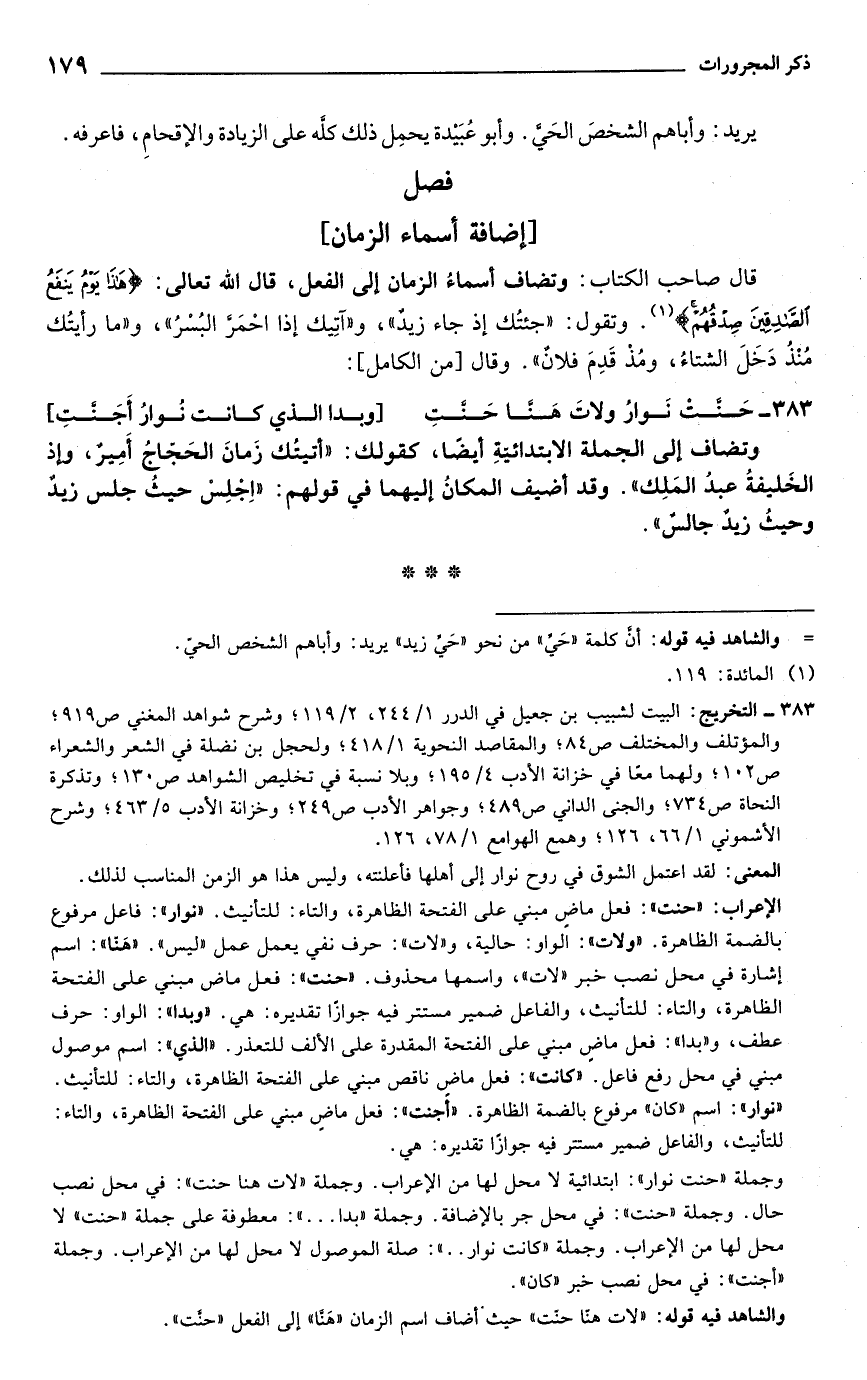 والشاهد فيه قوله: "لات هنّا حنّت" حيثْ أضاف اسم الزمان "هَنا" إلى الفعل "حنَّت".