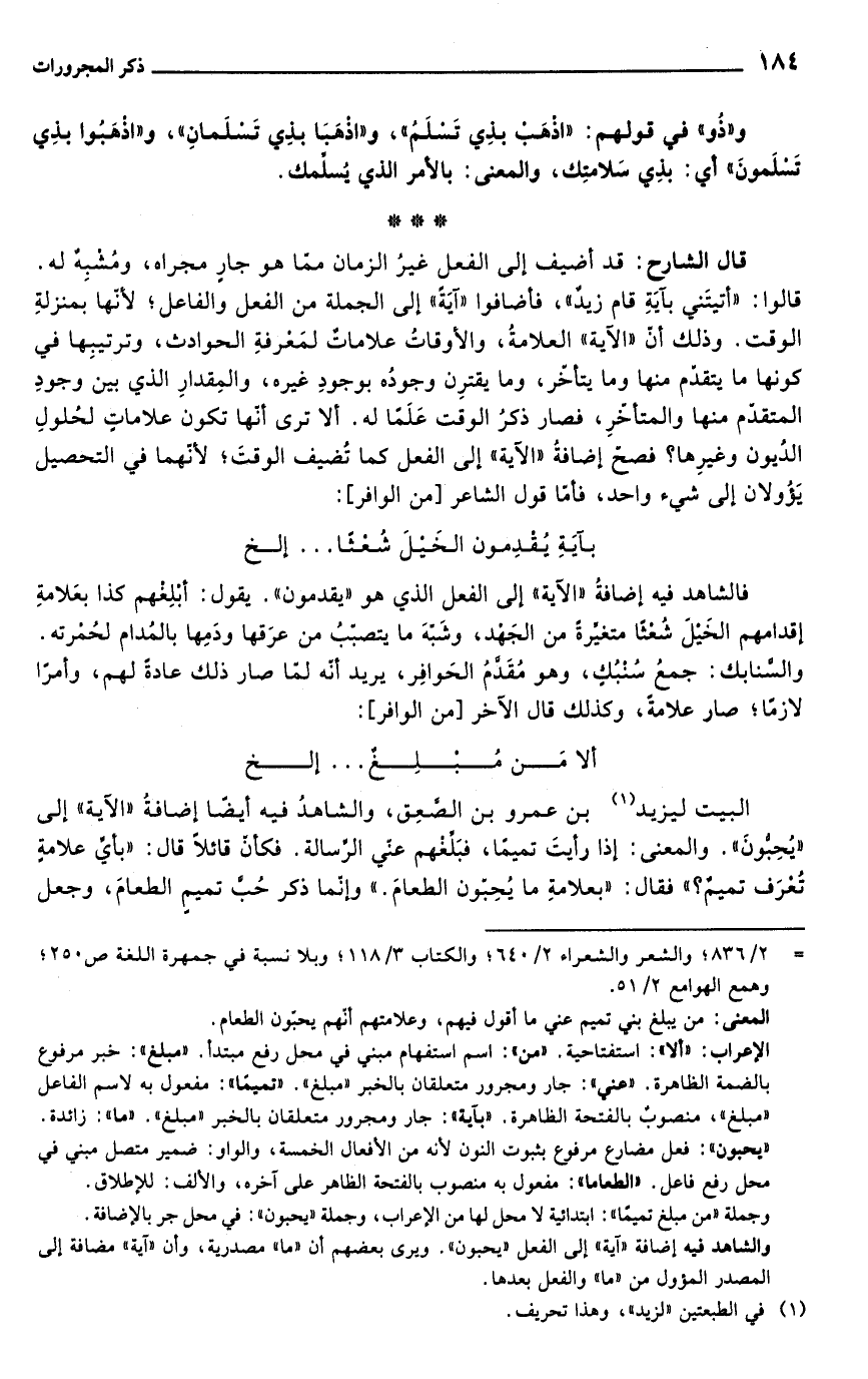 فالشاهد فيه إضافةُ "الآية" إلى الفعل الذي هو"يقدمون". يقول: أبلغهم كذا بعَلامةِ إقدامهم الخَيل شُعثًا متغيرة من الجَهْد، وشَبْهَ ما يتصبّبُ من عرَقها ودَمِها بالمُدام لحُمرته. والسنابك: جمعُ سُنبُك، وهو مُقَدمُ الحَوافِر، يريد أنه لمّا صار ذلك عادة لهم، وأمرًا لازمًا؛ صار علامة، وكذلك قال الآخر [من الوافر]: