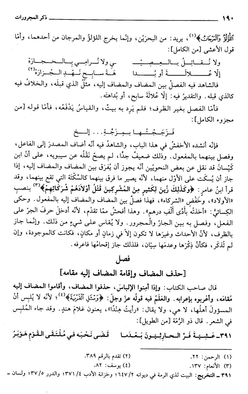 قال صاحب الكتاب: وإذا أمنوا الإلباس, حذفوا المضاف, وأقاموا المضاف إليه مقامه وأعربوه بإعرابه. والعلم فيه قوله تعالى: {واسأل القرية} (¬4)؛ لأنه لا يلبس أن المسؤول أهلها لا هي, ولا يقال: "رأيت هنداً", يعنون رأيت غلام هندٍ. وقد جاء الملبس في الشعر قال ذو الرمة [من الطويل]: