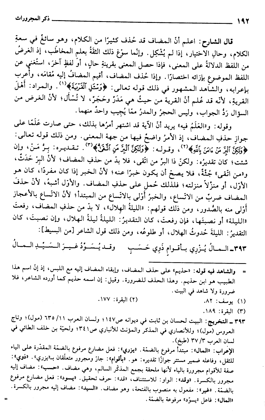 قال الشارح: اعلم أن المضاف قد حُذف كثيرًا من الكلام، وهو سائغُ في سعةِ الكلام، وحالِ الاختيار، إذا لم يُشكِل. وإنّما سوّغ ذلك الثقَةُ بعلم المخاطَب، إذ الغرضُ من اللفظ الدلالةُ على المعنى، فإذا حصل المعنى بقرينةِ حالٍ، أوَ لفظٍ آخرَ، استُغنى عن اللفظ الموضوع بإزائه اختصارًا. وإذا حُذف المضاف، أقيم المضافُ إليه مُقامَه، وأعرب بإعرابه، والشَاهد المشهور في ذلك قوله تعالى {وَاسْأَلِ الْقَرْيَة} (¬1). والمراد: أَهْلَ القريةِ؛ لأنه قد عُلم أن القرية من حيثُ هي مَدَرٌ وحَجَر، لا تُسأَل؛ لأن الغرض من السؤال رَدُّ الجواب، وليس الحجرُ والمدرُ مما يُجِيب واحدٌ منهما.