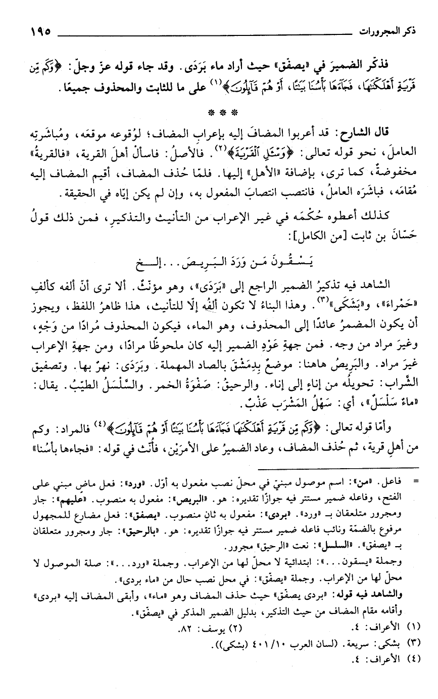 وأما قوله تعالى: {وَكَمْ مِنْ قَرْيَةٍ أَهْلَكْنَاهَا فَجَاءَهَا بَأْسُنَا بَيَاتًا أَوْ هُمْ قَائِلُونَ} (¬4) فالمراد: وكم من أهلِ قرية، ثم حُذف المضاف، وعاد الضميرُ على الأمرَيْن، فأُنث في قوله: "فجاءها بأسُنا"