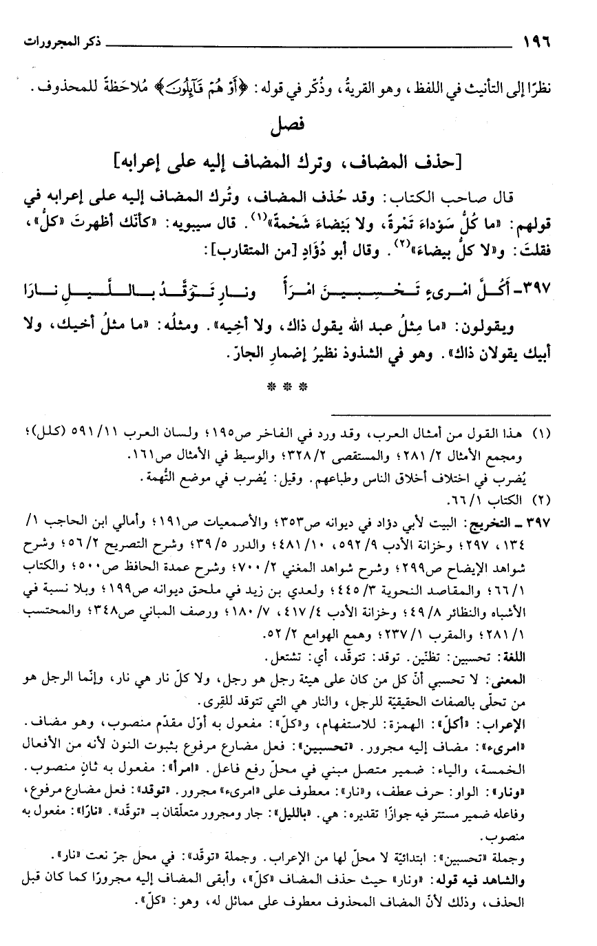 والشاهد فيه قوله: "ونار" حيث حذف المضاف "كل"، وأبقى المضاف إليه مجرورًا كما كان قبل الحذف، وذلك لأن المضاف المحذوف معطوف على مماثل له، وهو: "كلّ".