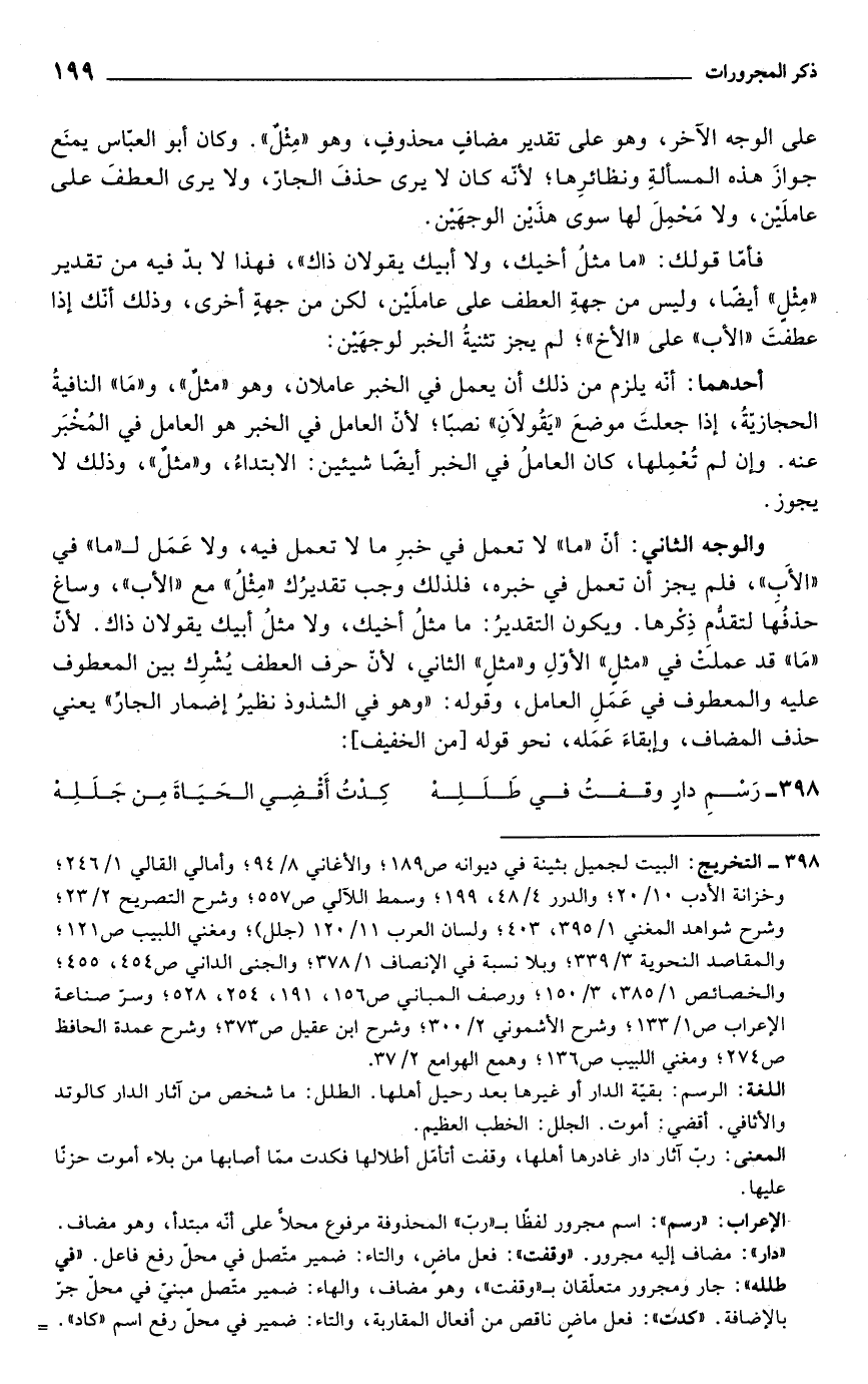 398 - التخريج: البيت لجميل بثينة في ديوانه ص 189؛ والأغاني 8/ 94؛ وأمالي القالي 1/ 246؛ وخزانة الأدب 10/ 20؛ والدرر 4/ 48، 199؛ وسمط اللآلي ص 557؛ وشرح التصريح 2/ 23؛ وشرح شواهد المنغي 1/ 395، 403؛ ولسان العرب 11/ 120 (جلل)؛ ومغني اللبيب ص 121؛ والمقاصد النحوية 3/ 339؛ وبلا نسبة في الإنصاف 1/ 378؛ والجنى الداني ص 454، 455؛ والخصائص 1/ 385، 3/ 150؛ ورصف المباني ص 156، 191، 254، 528؛ وسرّ صناعة الإعراب ص 1/ 133؛ وشرح الأشموني 2/ 300؛ وشرح ابن عقيل ص 373؛ وشرح عمدة الحافظ ص 274؛ ومغني اللبيب ص 136؛ وهمع الهوامع 2/ 37.