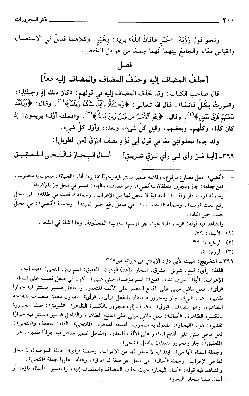 ونحو قولِ رُؤْبَةَ: "خَير عافاكَ الله" يريد: بِخَيْرٍ. وكلاهما قليلٌ في الاستعمال والقياس معًا، والجامعُ بينهما أَنهما جميعًا من عواملِ الخفض.
