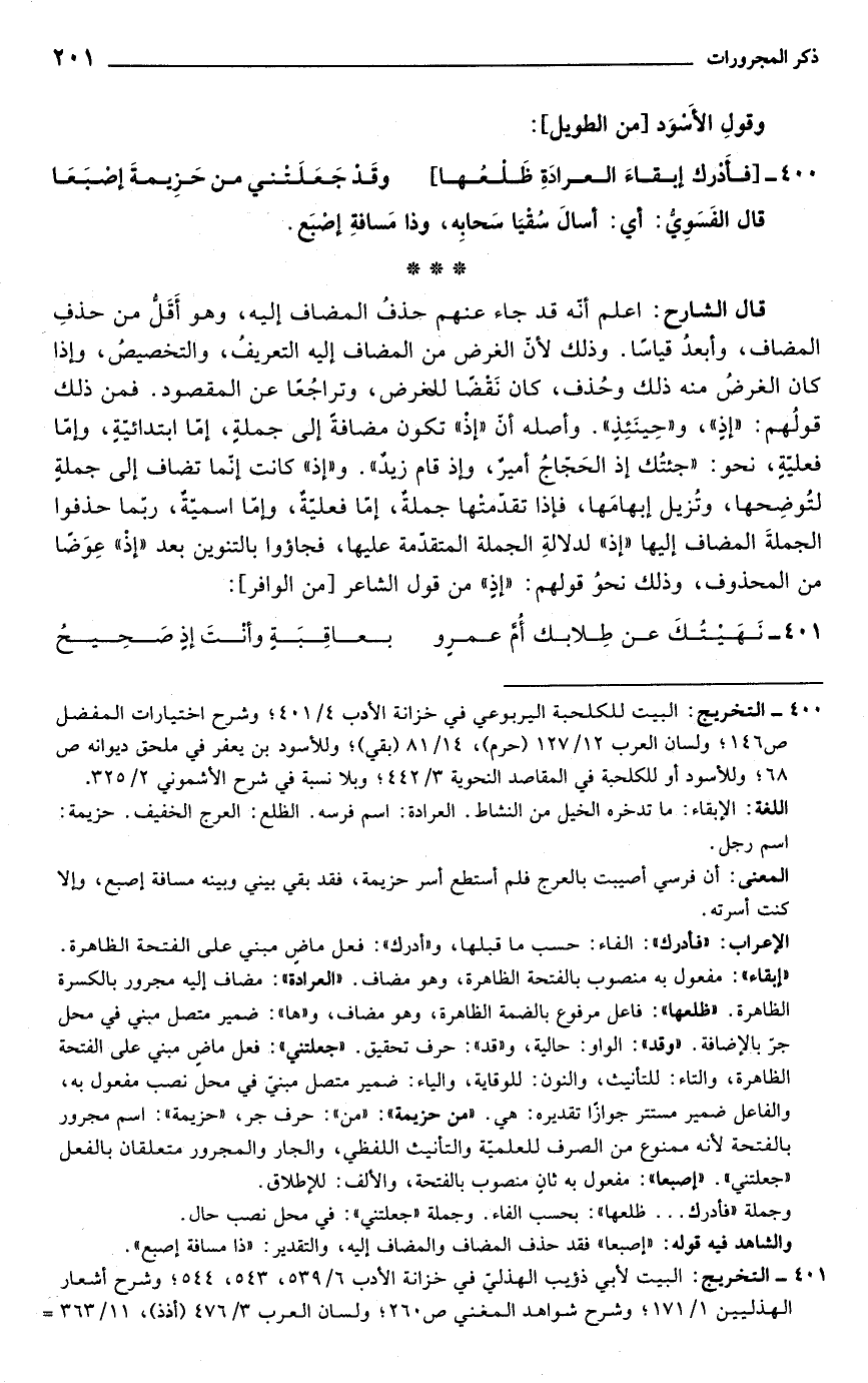 401 - التخريج: البيت لأبي ذؤيب الهذلي في خزانة الأدب 6/ 539، 543، 544؛ وشرح أشعار الهذليين 1/ 171؛ وشرح شواهد المغني ص 260؛ ولسان العرب 3/ 476 (أذذ)، 11/ 363=