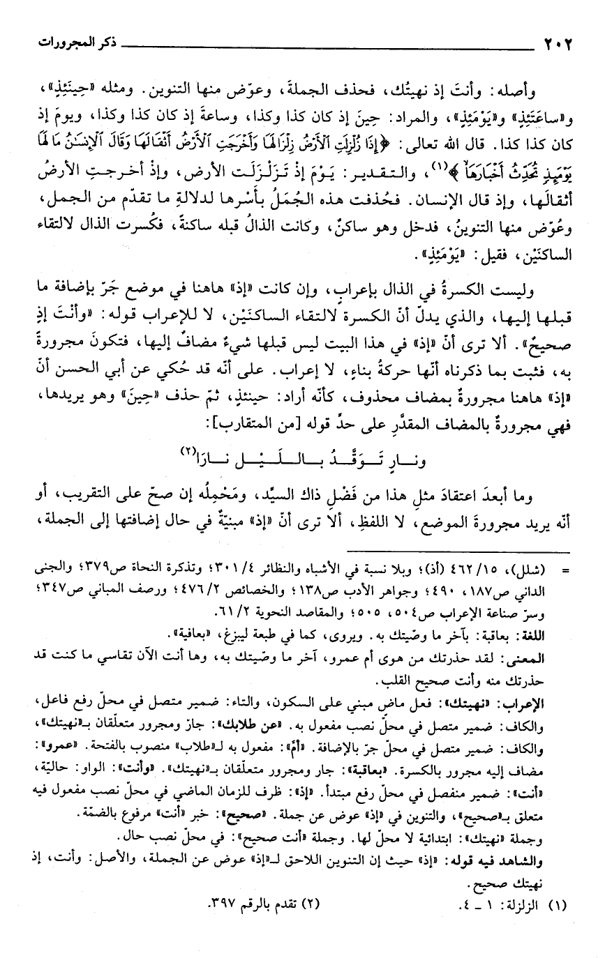 وأصله: وأنتَ إذ نهيتُك، فحذف الجملة، وعوّض منها التنوين. ومثله "حِينَئِذٍ"، و"ساعَتَئِذٍ" و"يَؤمَئِذٍ"، والمراد: حِينَ إذ كان كذا وكذا، وساعةَ إذ كان كذا وكذا، ويومَ إذ كان كذا كذا. قال الله تعالى: {إِذَا زُلْزِلَتِ الْأَرْضُ زِلْزَالَهَا (1) وَأَخْرَجَتِ الْأَرْضُ أَثْقَالَهَا (2) وَقَالَ الْإِنْسَانُ مَا لَهَا (3) يَوْمَئِذٍ تُحَدِّثُ أَخْبَارَهَا} (¬1)، والتقدير: يَومَ إذ تَزَنزَلَت الأرض، وإذا أخرجتِ الأرضُ أثقالَها، وإذ قال الإنسان. فحُذفت هذه الجُمَلُ بأَسْرها لدلالةِ ما تقدّم من الجمل، وعُوّض منها التنوينُ، فدخل وهو ساكن، وكانت الذالُ قبله ساكنةً، فكُسرت الذال لالتقاء الساكنَين، فقيل: "يَوْمَئذٍ".