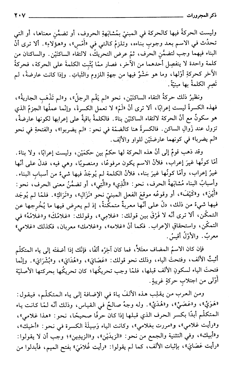 ونظيرُ ذلك حركةُ التقاء الساكنَين، نحو "لم يَقُم الرجلُ" و"لم تَذْهَب الجاريةُ"، فهذه الكسرةُ ليست إعرابًا، ألا ترى أنّ "لَمْ" لا تعمل الكسرةَ، وإنما عملُهاَ الجزمُ الذي هو سكونٌ مع أن الحركة لالتقاء الساكنَئن بناءٌ. فالكلمةُ باقيةُ على إعرابها لكونها عارضةً، تزول عند زَوالِ الساكن. فالكسرةُ هنا كالضمة في نحو: "لم يضربوا"، والفتحةِ في نحو "لم يضربا" في كونهما عارضتَين للواو والألِف.
