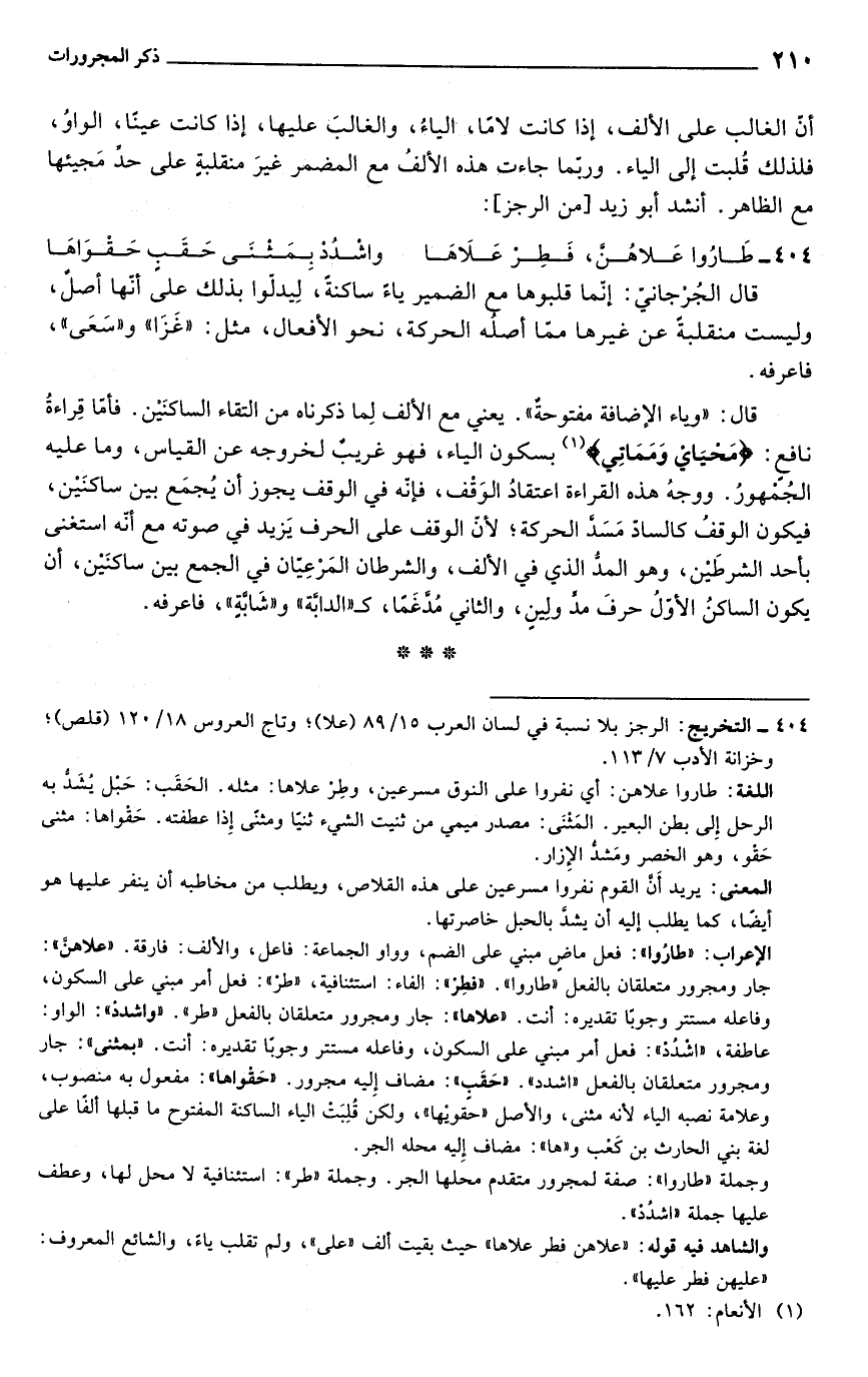 404 - التخريج: الرجز بلا نسبة في لسان العرب 15/ 89 (علا)؛ وتاج العروس 18/ 120 (قلص)؛ وخزانة الأدب 7/ 113.