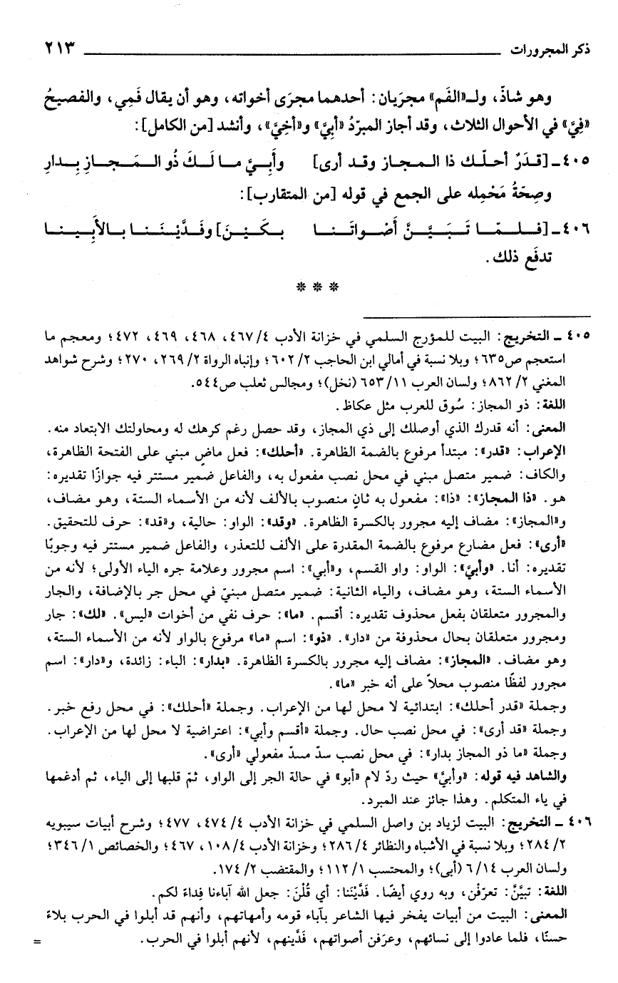 الإعراب: "قدر": مبتدأ مرفوع بالضمة الظاهرة. "أحلك": فعل ماضٍ مبني على الفتحة الظاهرة، والكاف: ضمير متصل مبني في محل نصب مفعول به، والفاعل ضمير مستتر فيه جوازًا تقديره: هو."ذا المجاز": "ذا": مفعول به ثانٍ منصوب بالألف لأنه من الأسماء الستة، وهو مضاف، و"المجاز": مضاف إليه مجرور بالكسرة الظاهرة. "وقد": الواو: حالية، و"قد": حرف للتحقيق. "أرى": فعل مضارع مرفوع بالضمة المقدرة على الألف للتعذر، والفاعل ضمير مستتر فيه وجوبًا تقديره: أنا."وأبيَّ": الواو: واو القسم، و"أبي": اسم مجرور وعلامة جره الياء الأولى؛ لأنه من الأسماء الستة، وهو مضاف، والياء الثانية: ضمير متصل مبني في محل جر بالإضافة، والجار والمجرور متعلقان بفعل محذوف تقديره: أقسم. "ما": حرف نفي من أخوات "ليس". "لك": جار ومجرور متعلقان بحال محذوفة من "دار". "ذو": اسم "ما" مرفوع بالواو لأنه من الأسماء الستة، وهو مضاف. "المجاز": مضاف إليه مجرور بالكسرة الظاهرة. "بدار": الباء: زائدة، و"دار": اسم مجرور لفظًا منصوب محلاً على أنه خبر "ما".